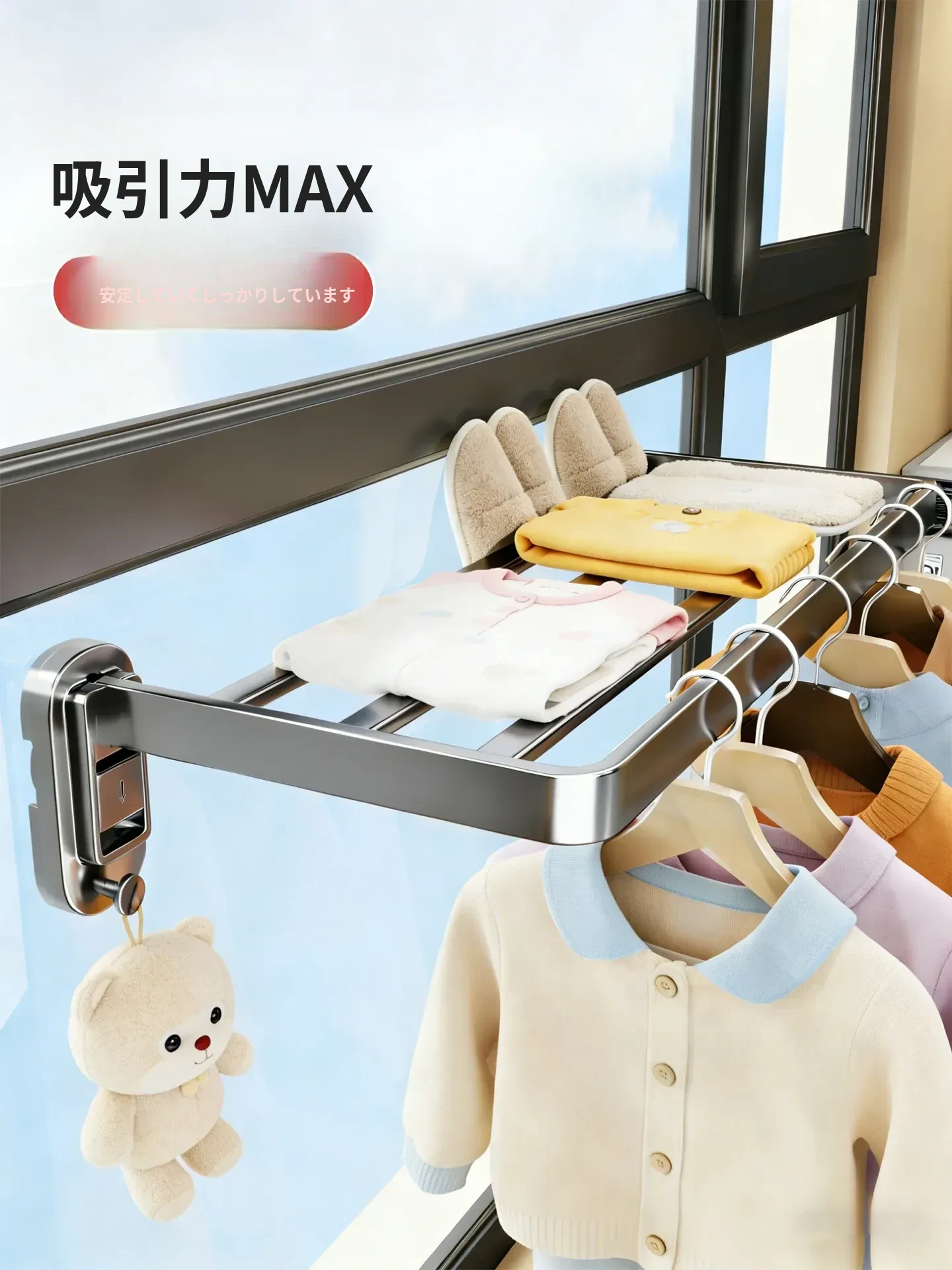 バルコニー用吸盤式壁掛け物干しラック - 簡単取り付けで穴あけ不要!室内でも使える折りたたみ式で、靴や衣類をしっかり干せる便利アイテム!