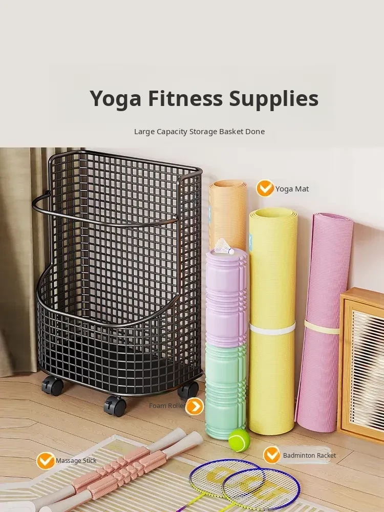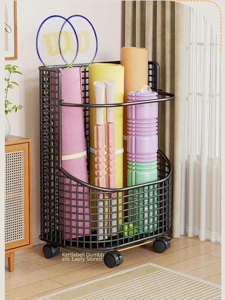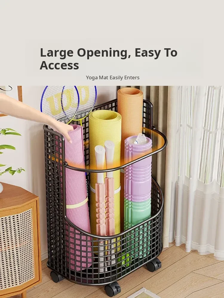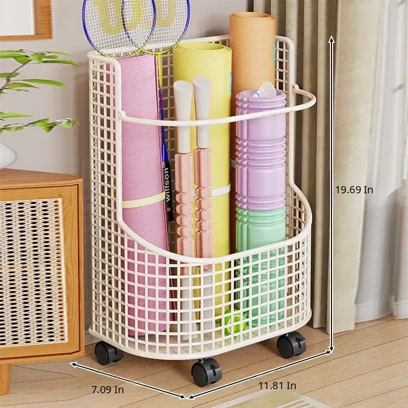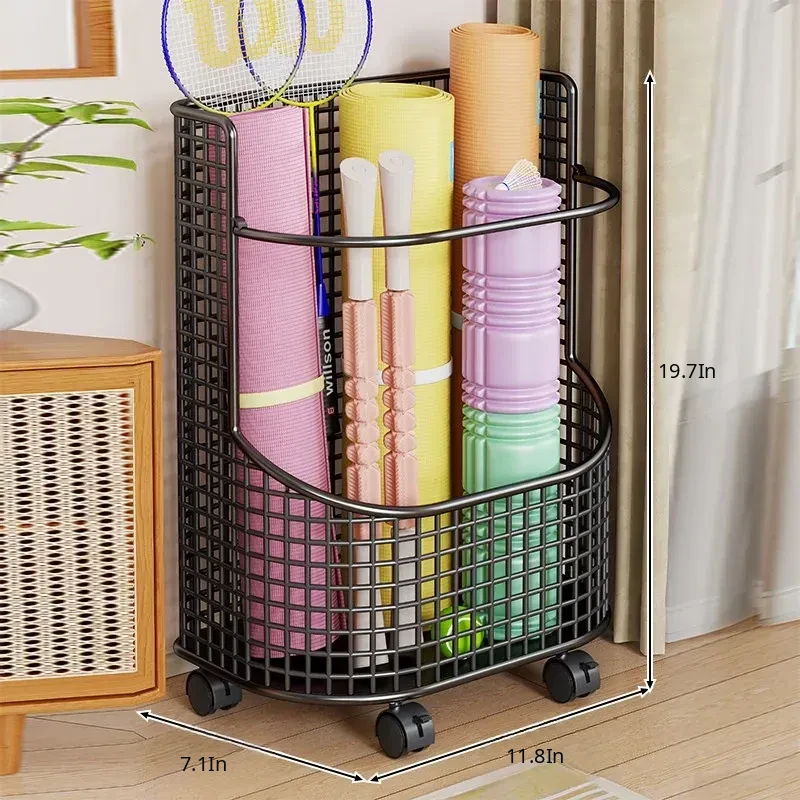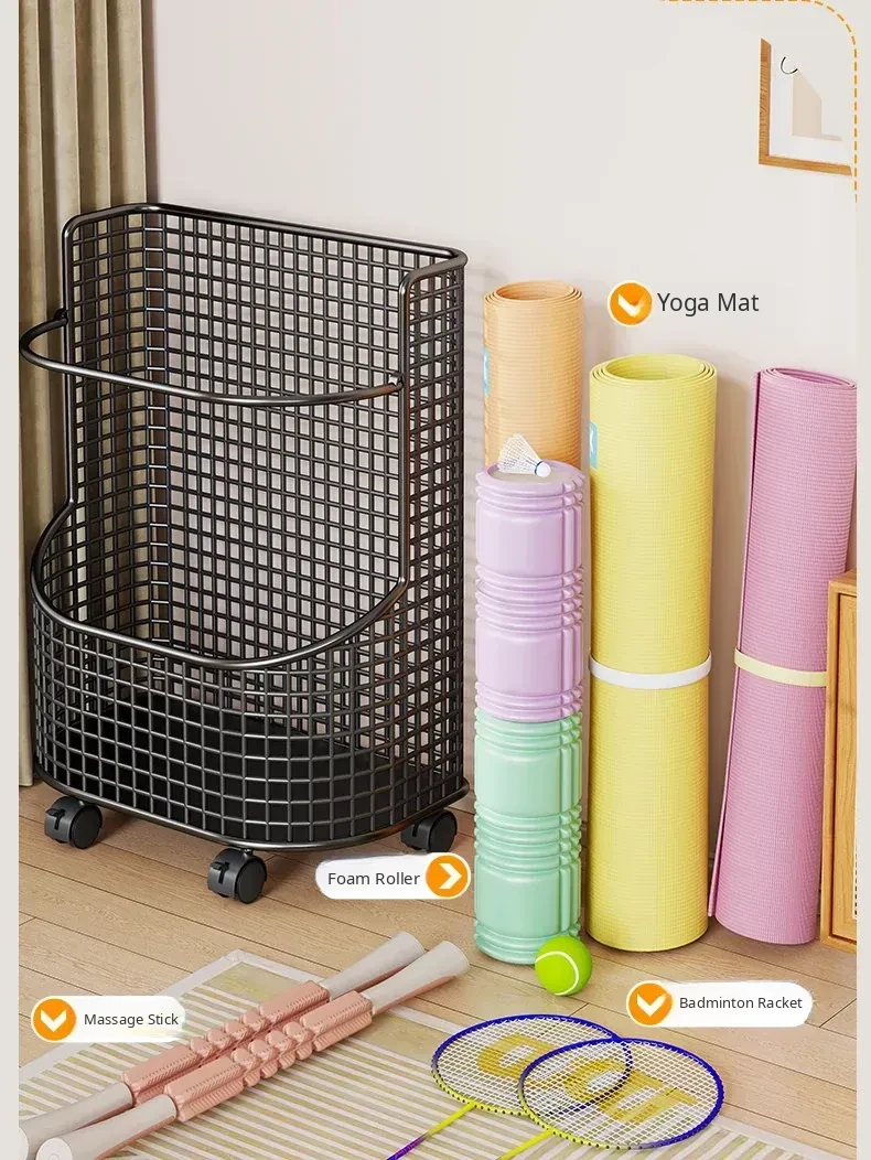 Large Capacity Yoga Mat Storage Basket with Wheels - Portable Racket Organizer for Home Gym Equipment, Ideal for Easy Access and Neat Organization