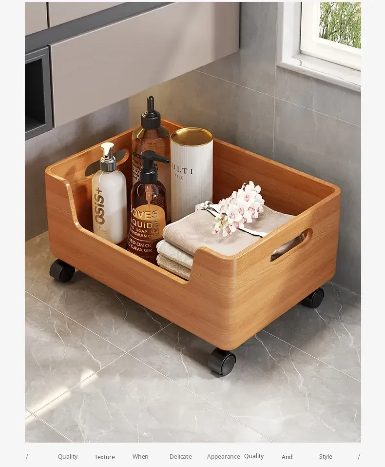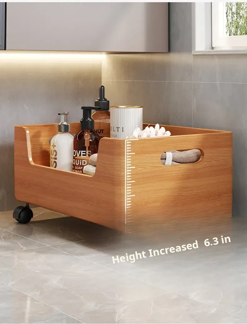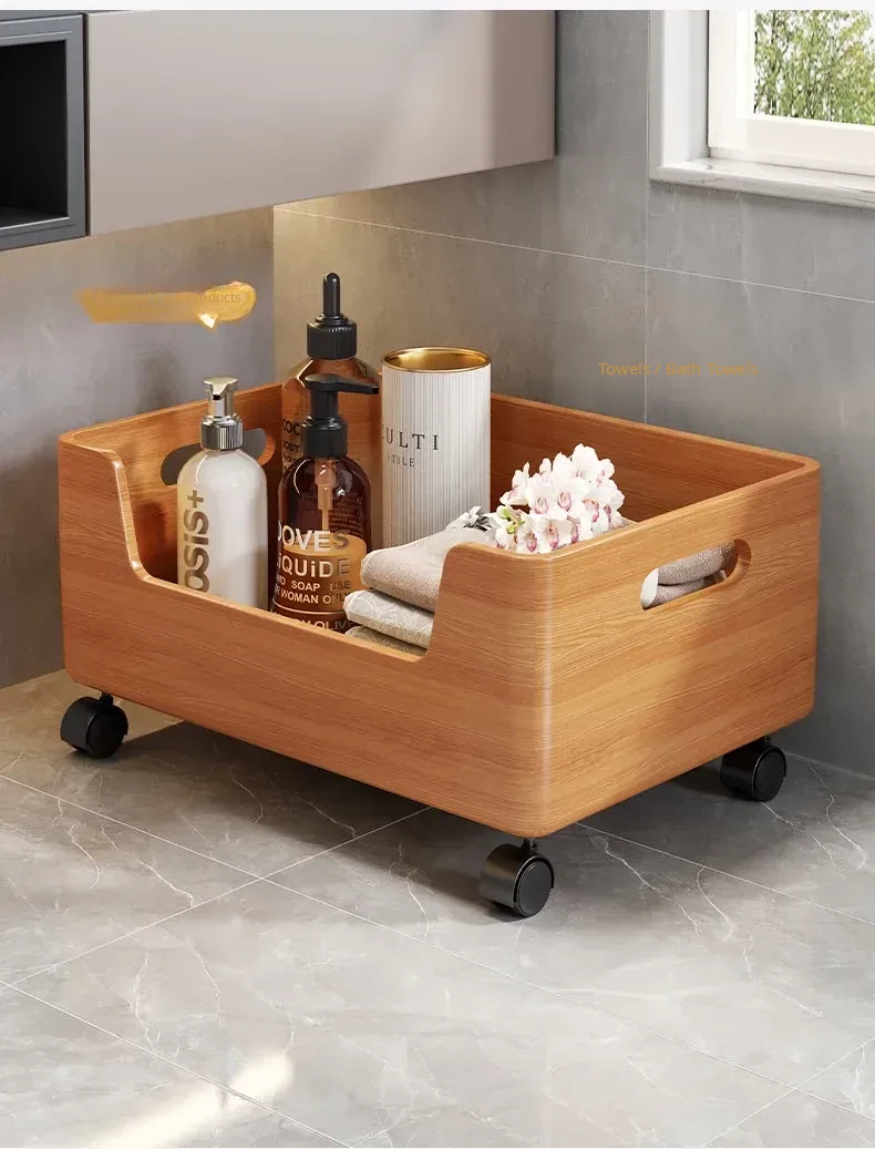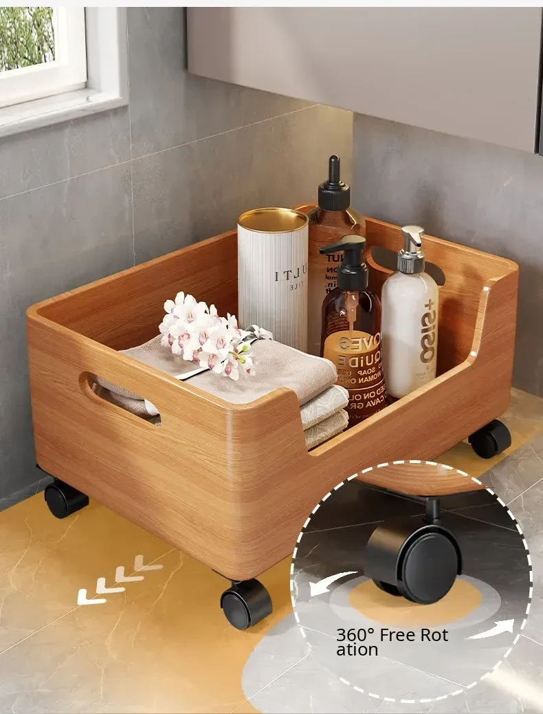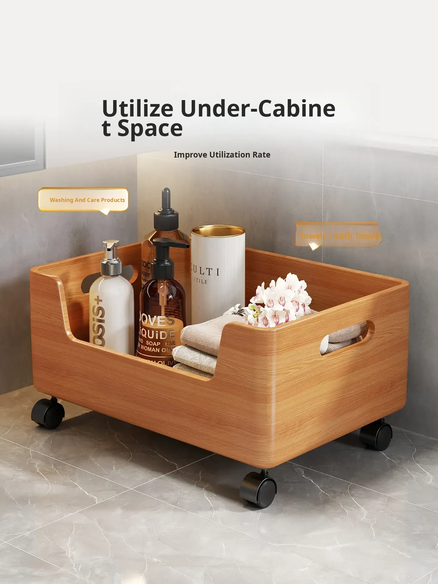Stylish Solid Wood Bathroom Vanity Storage Shelf - Multi-Functional Under-Sink Organizer with Laundry Basket, Detergent Holder & Convenient Rolling Cart for Your Bathroom Needs