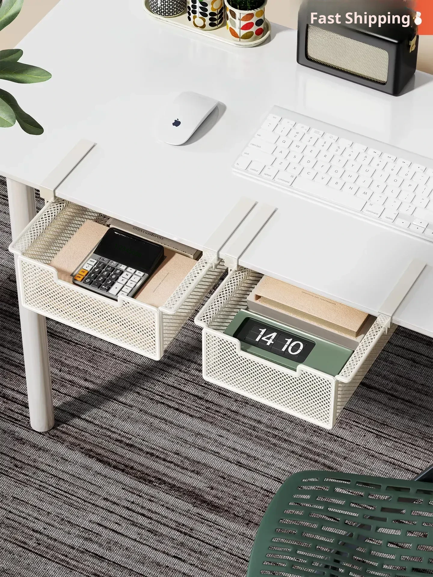 Under-Desk Hanging Storage Rack with Pull-Out Basket - No Drilling Required, Large Capacity, Multi-Functional Organizer for Office Use