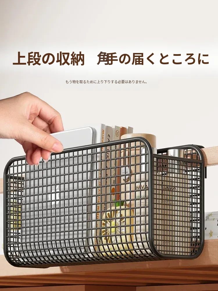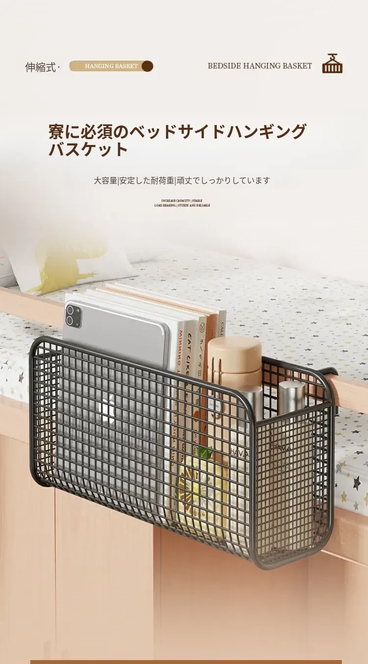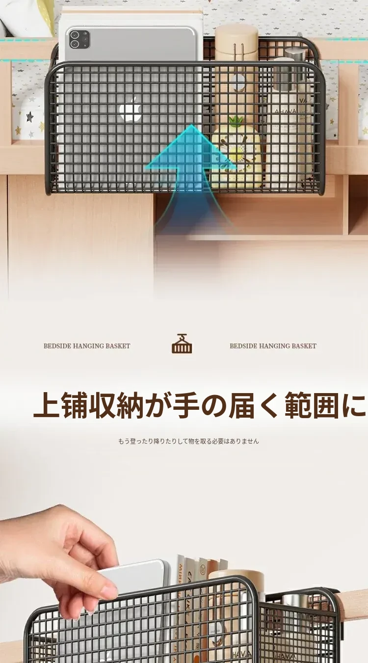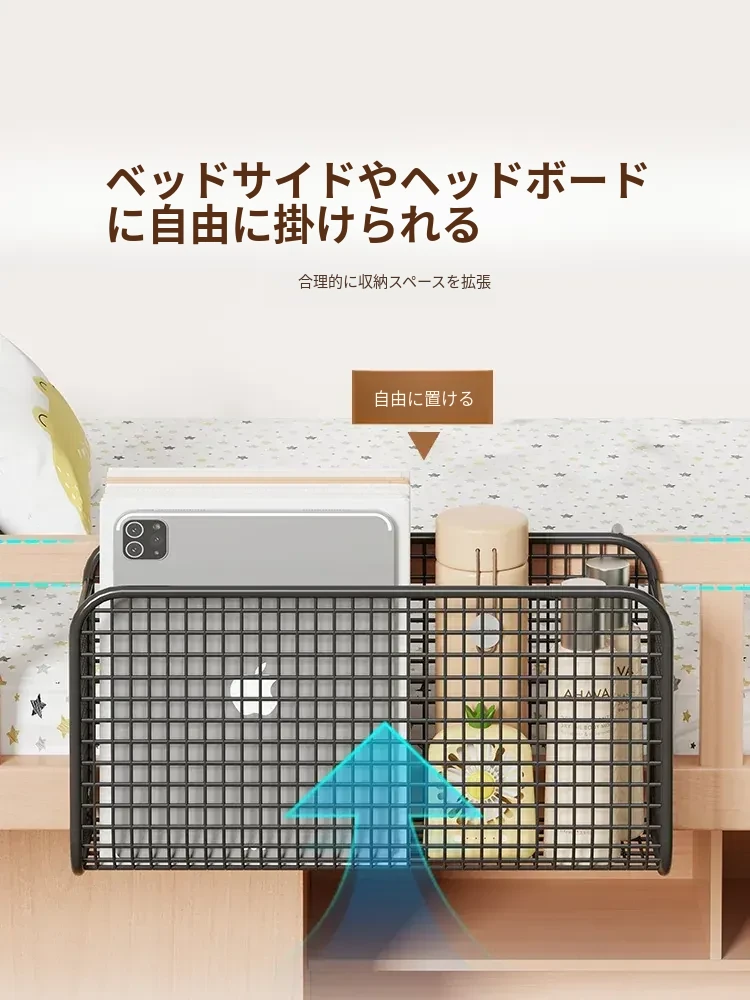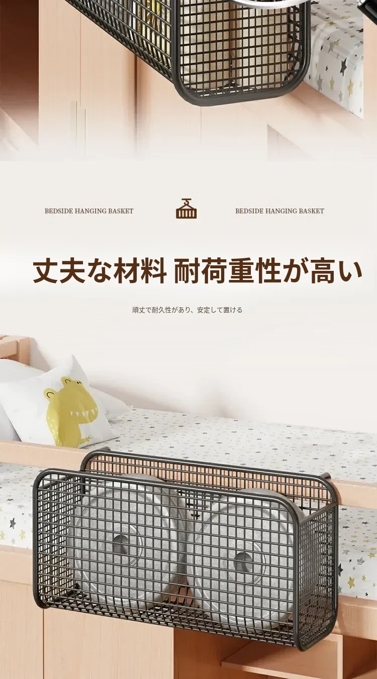 学生寮にぴったり!穴を開けずに簡単取り付け、多機能ハンギング収納バスケット。お菓子や本をスマートに収納できる、ベッドサイドの必需品です!