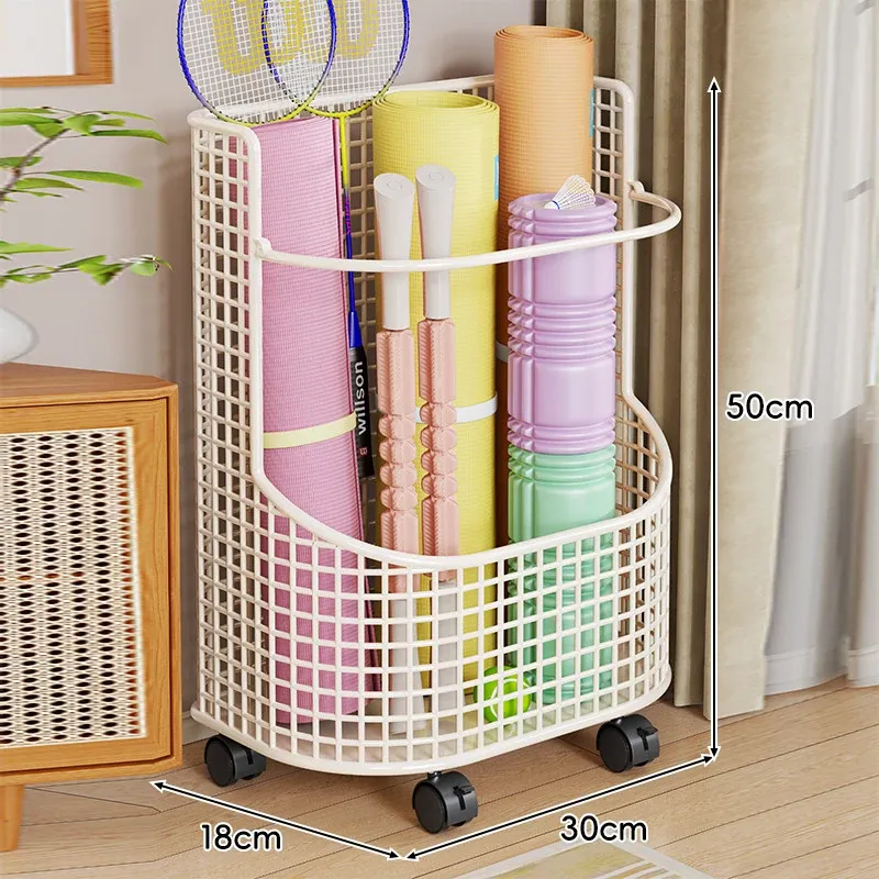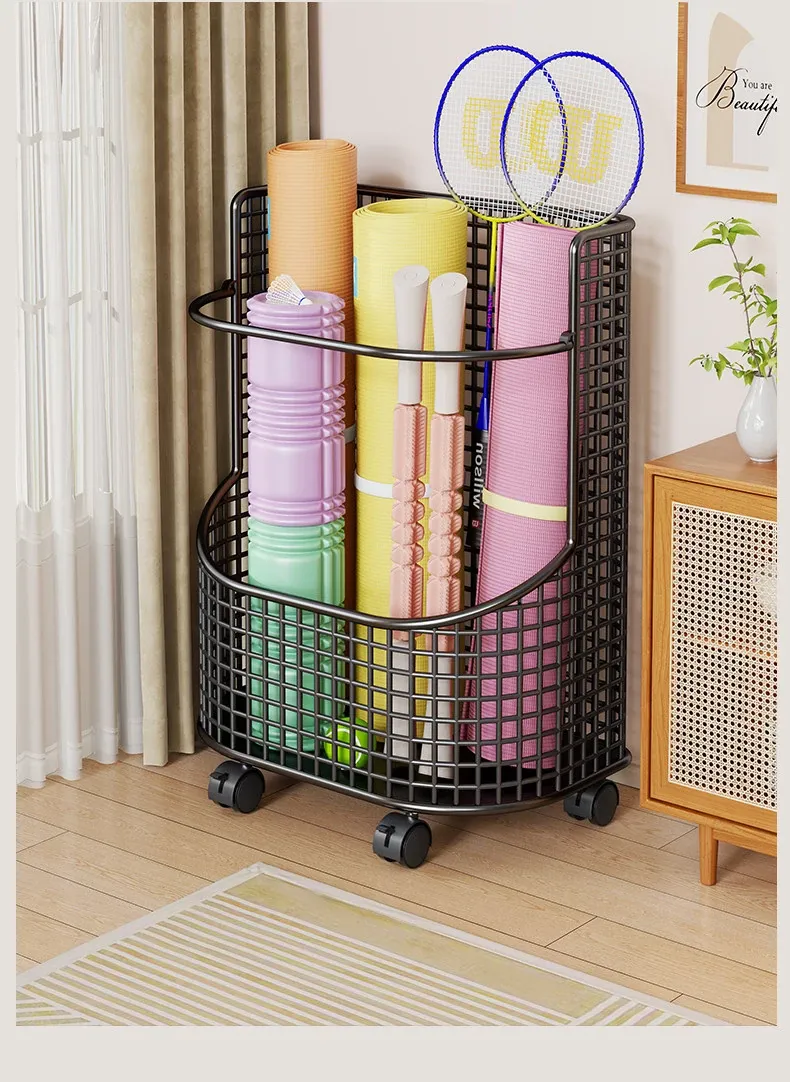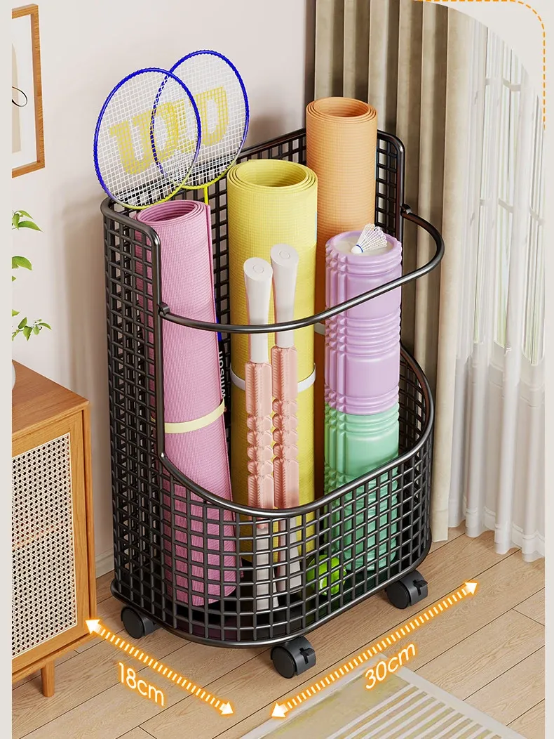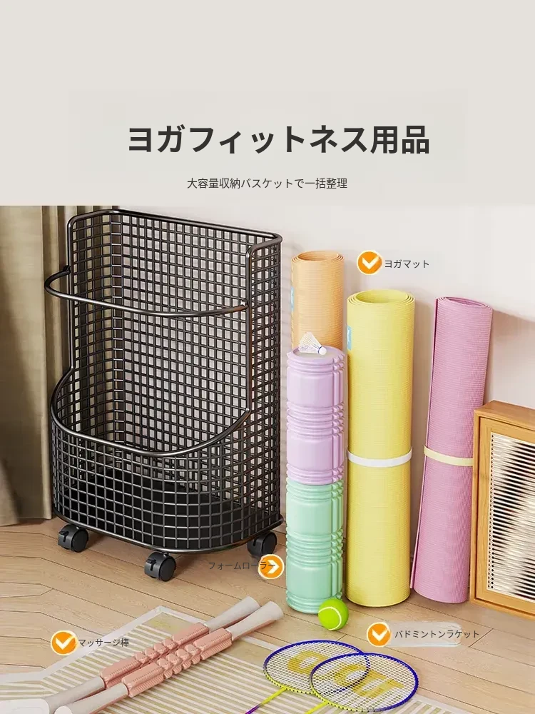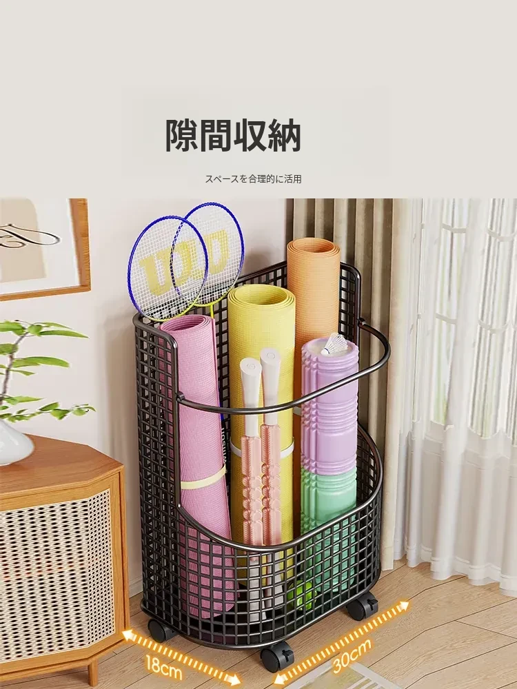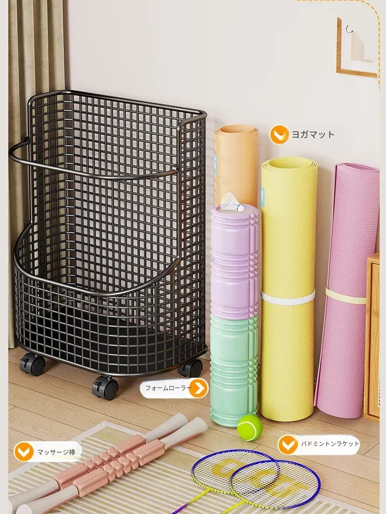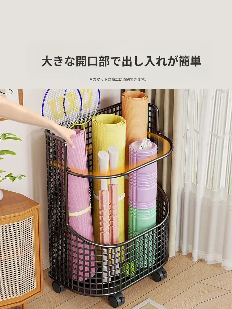 ヨガマット収納バスケット 大容量キャスター付き 移動可能 バドミントンラケット収納ラック フィットネス器具用収納棚 - おしゃれで便利な収納ソリューション!