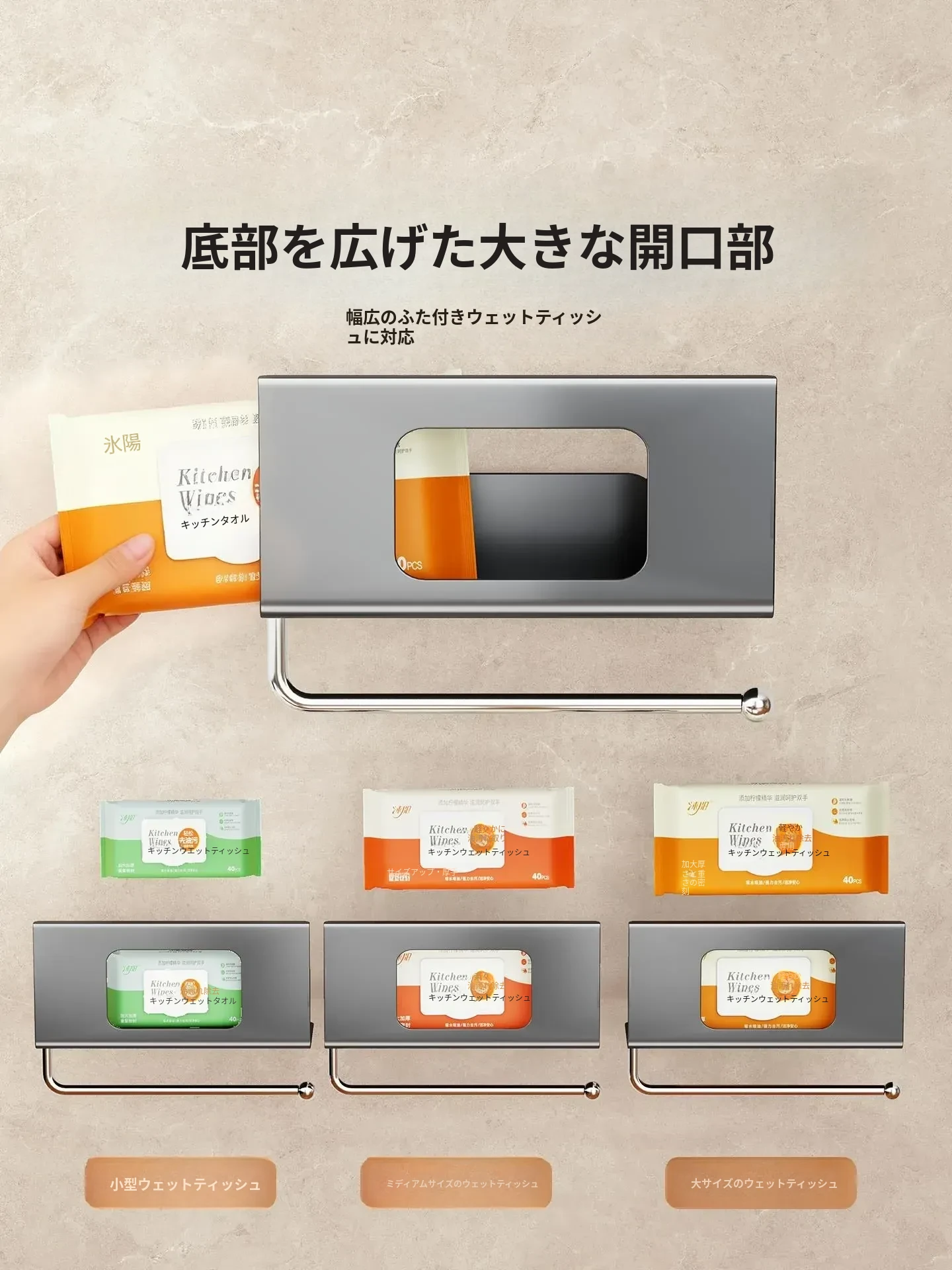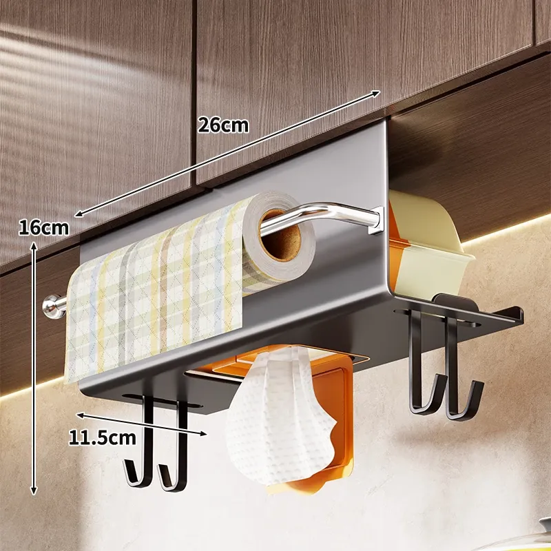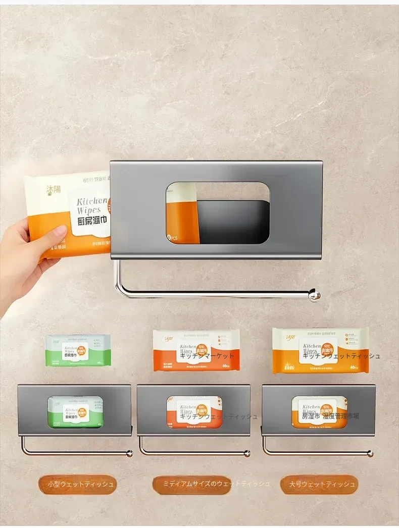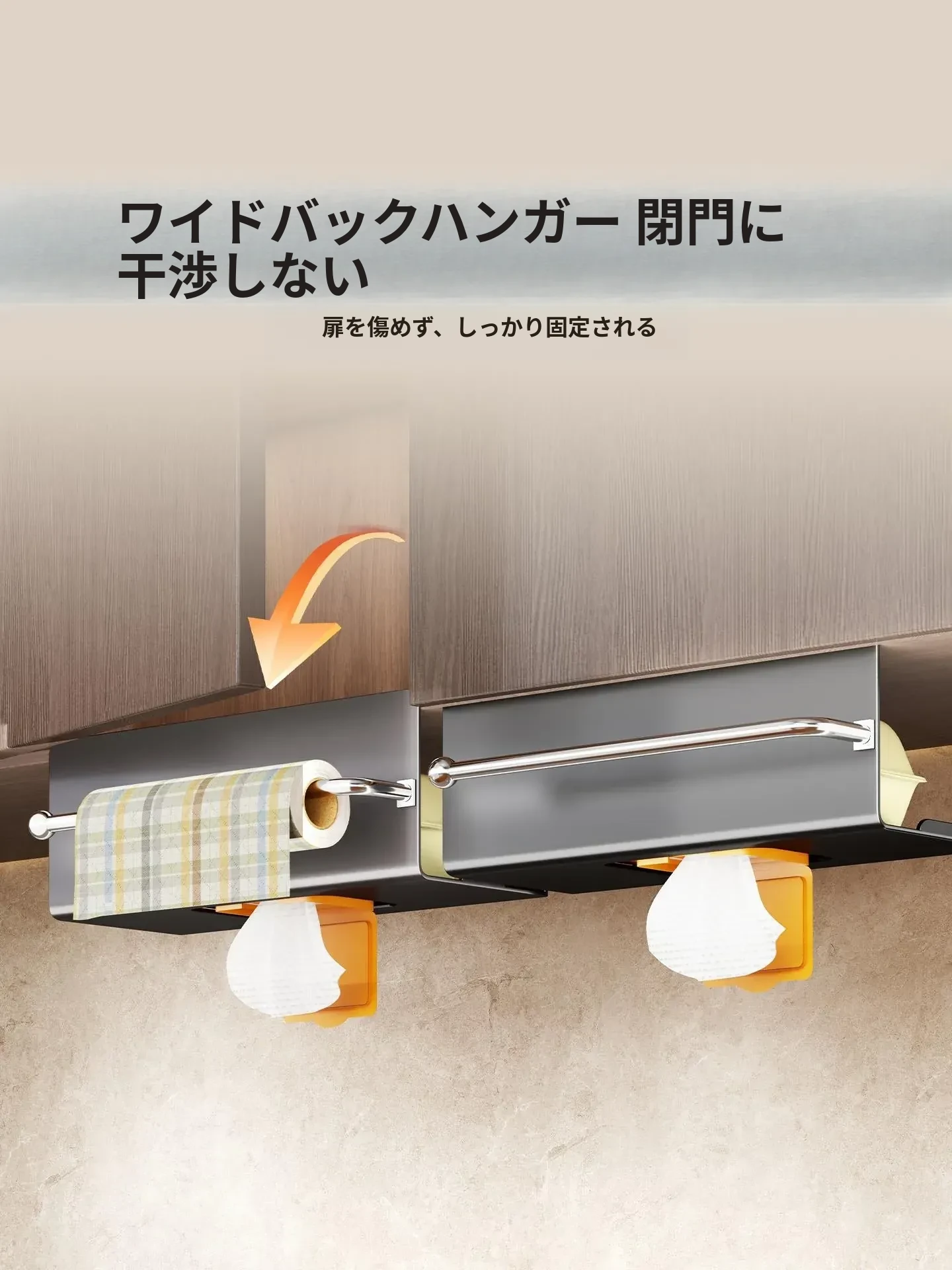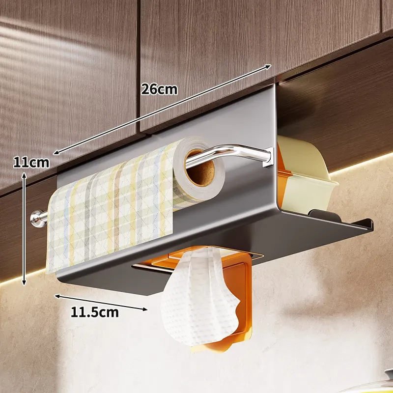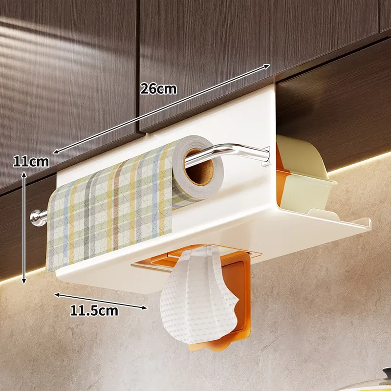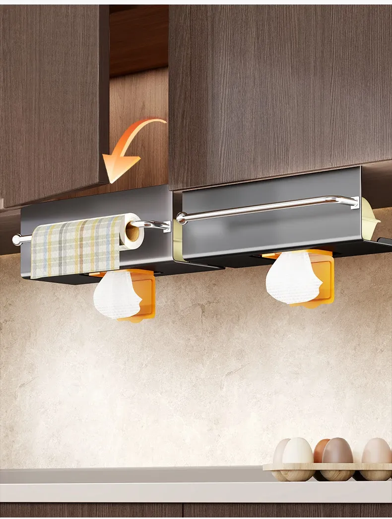 キッチン用吊り下げティッシュホルダー - 家庭用キャビネットに最適!ウェットティッシュやペーパータオルをスマートに収納できる、多機能&取り付け不要のデザイン。油吸収紙やクロスも掛けられて、キッチンをすっきり整頓!