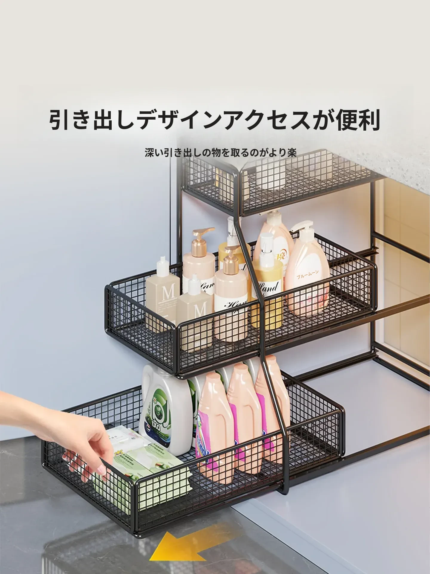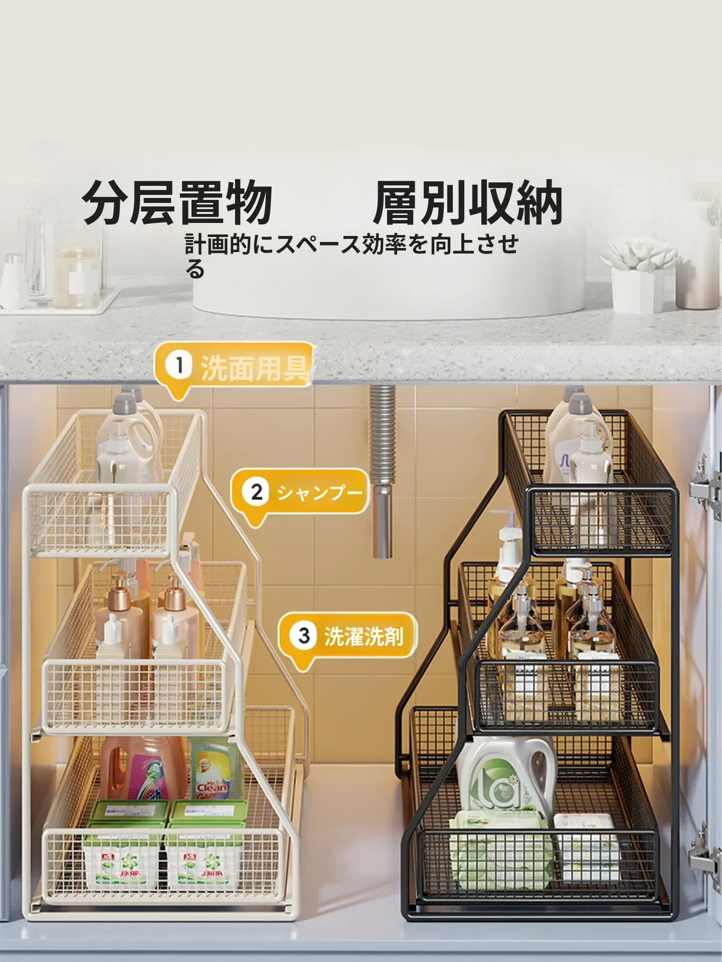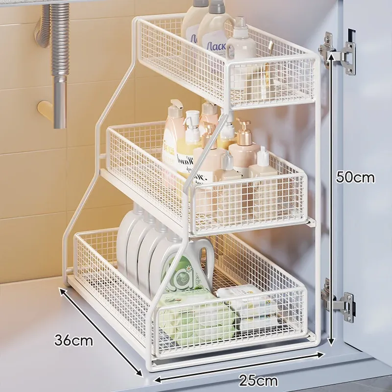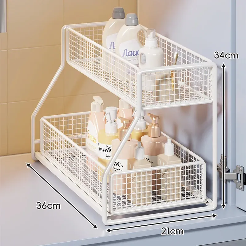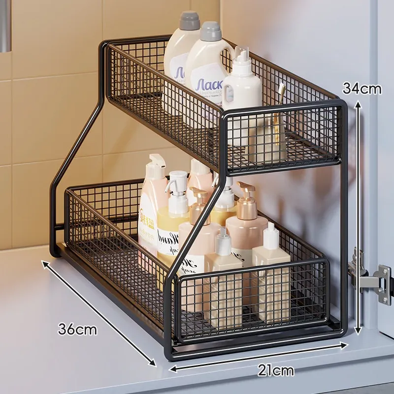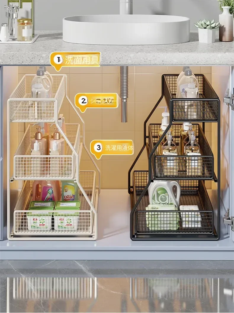 引き出し式収納ラック - 洗面台や浴室に最適な多機能バスケット!洗剤や小物の整理整頓にぴったり。省スペースでスッキリ収納でき、使いやすさ抜群のアイテムです!