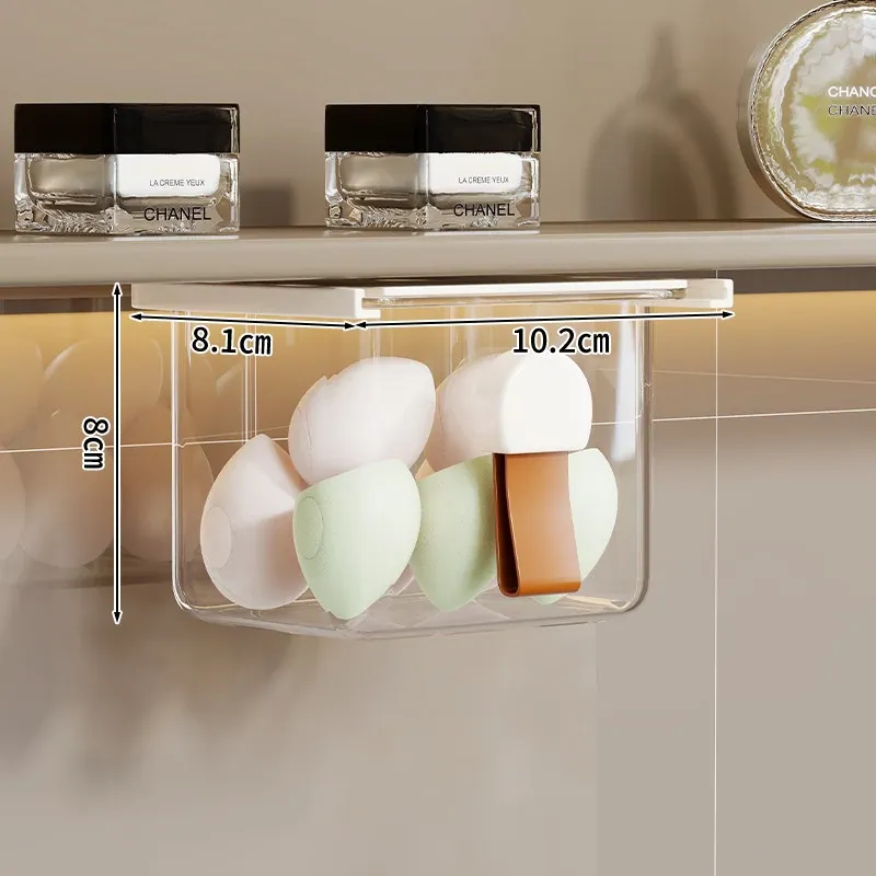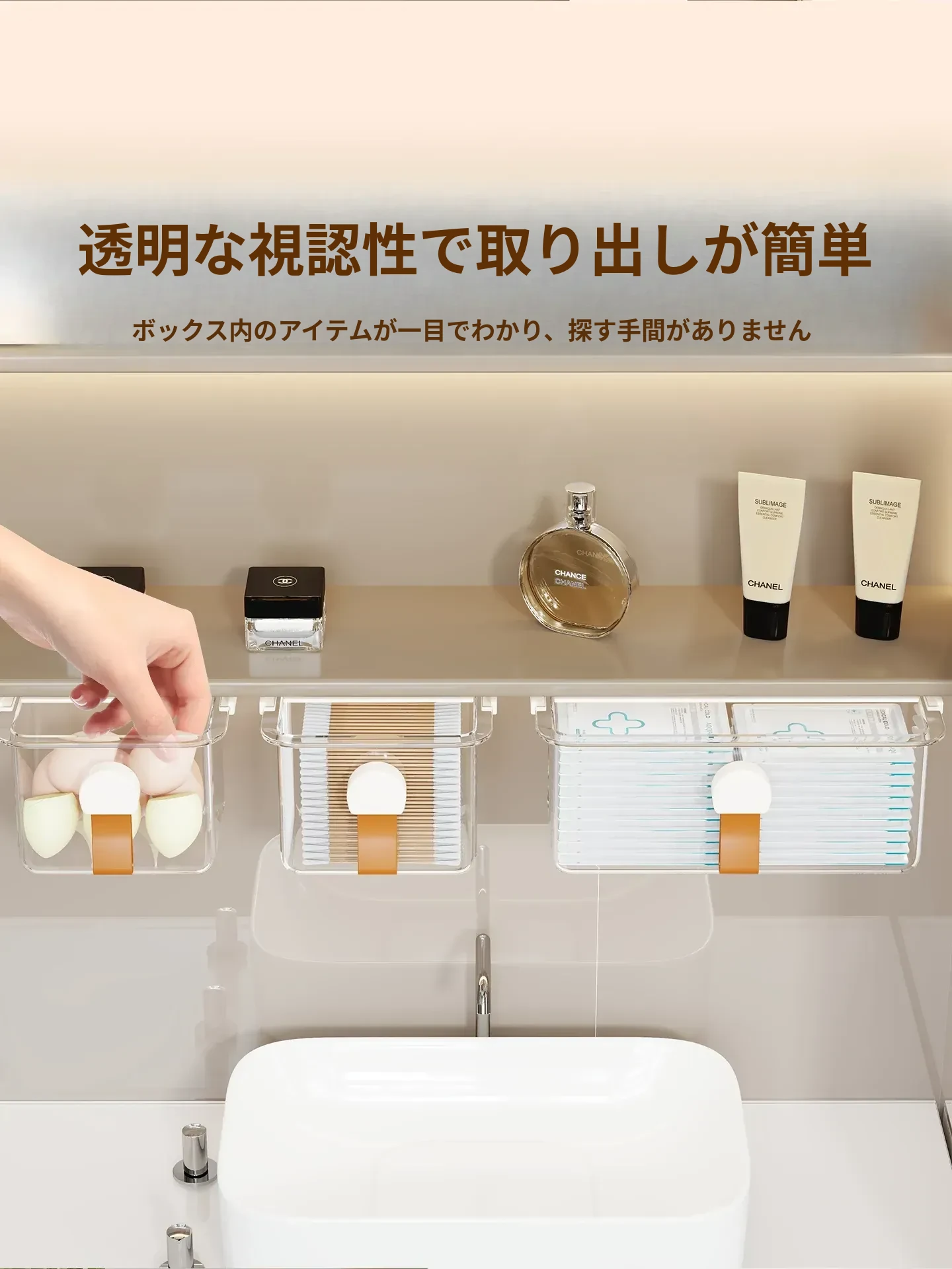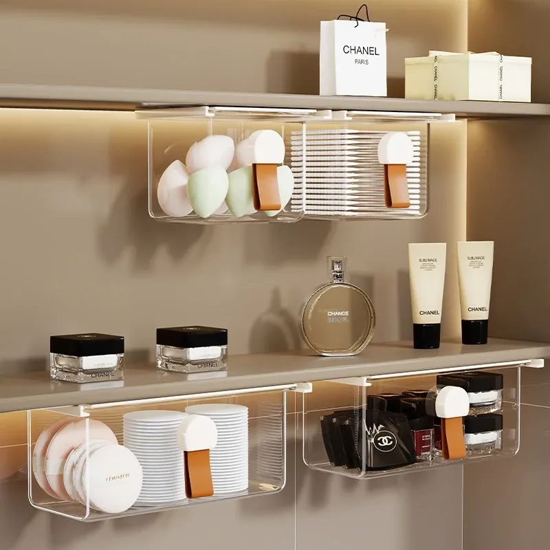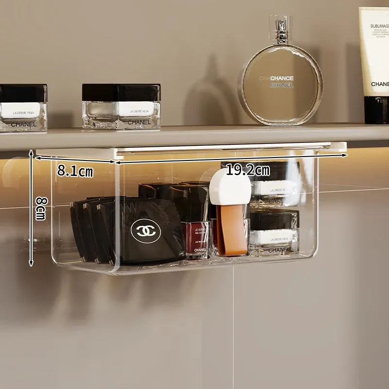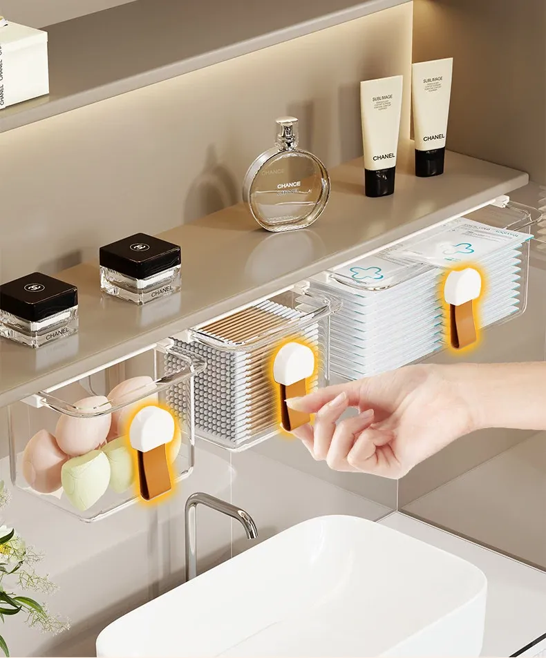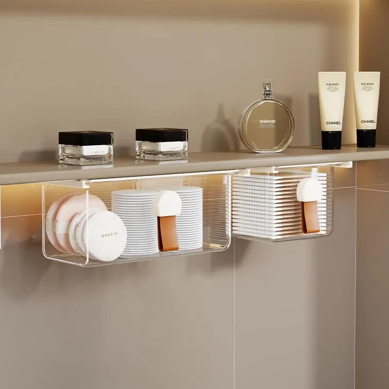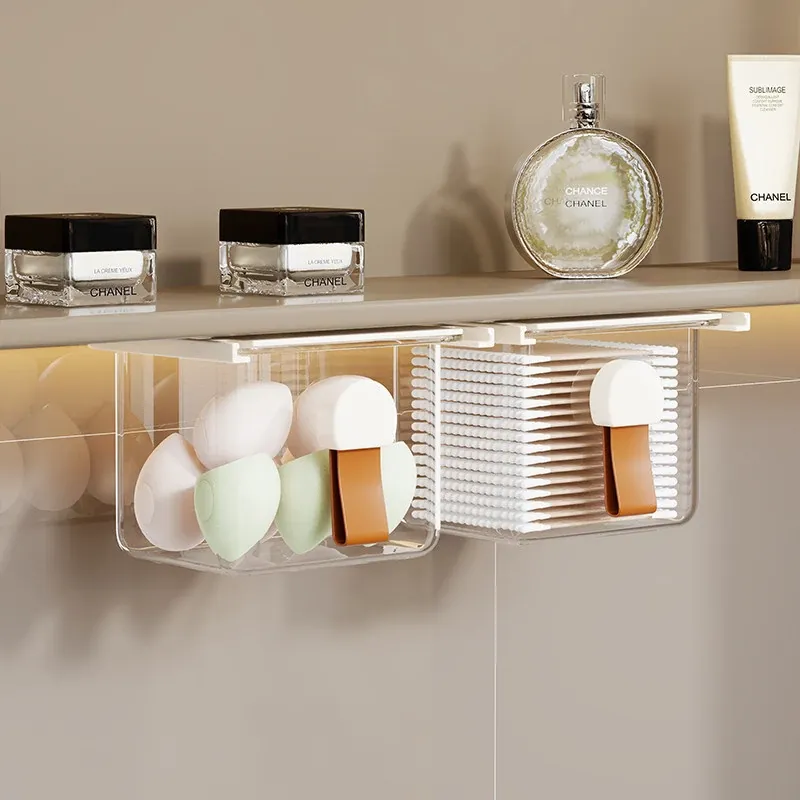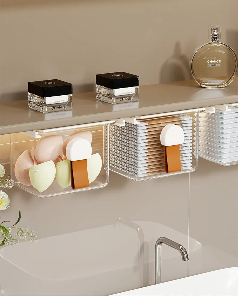 洗面台の多機能収納ボックス - メイク落としコットンやリップスティック、綿棒をすっきり整理!透明なデザインで、使いやすさ抜群の収納神器!