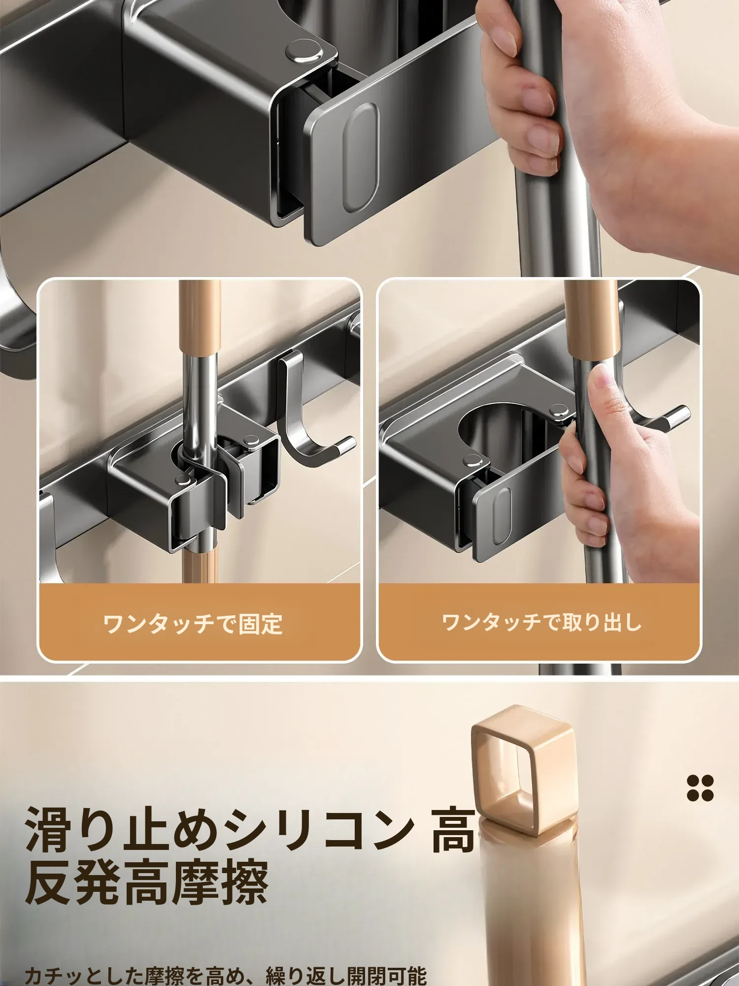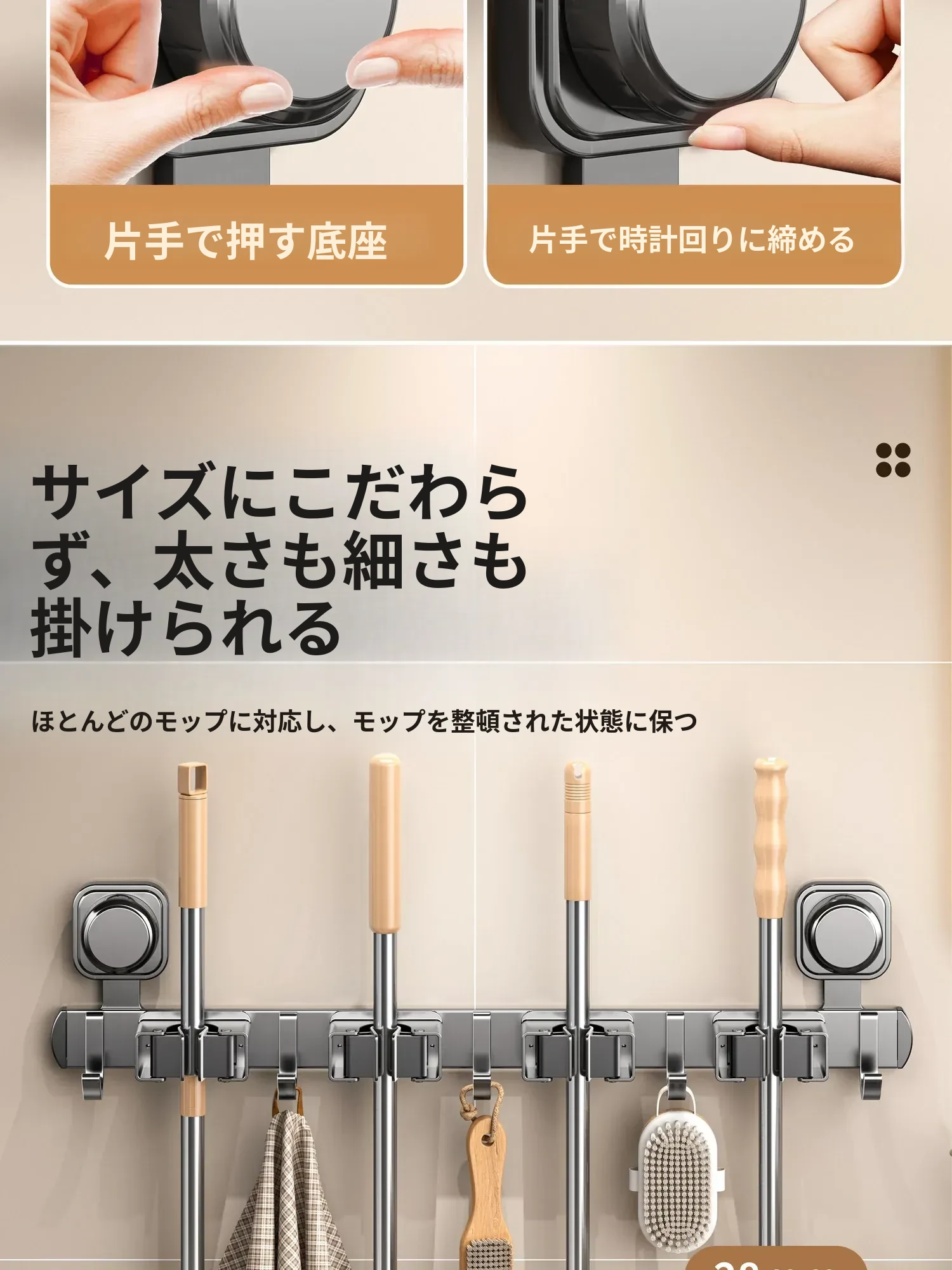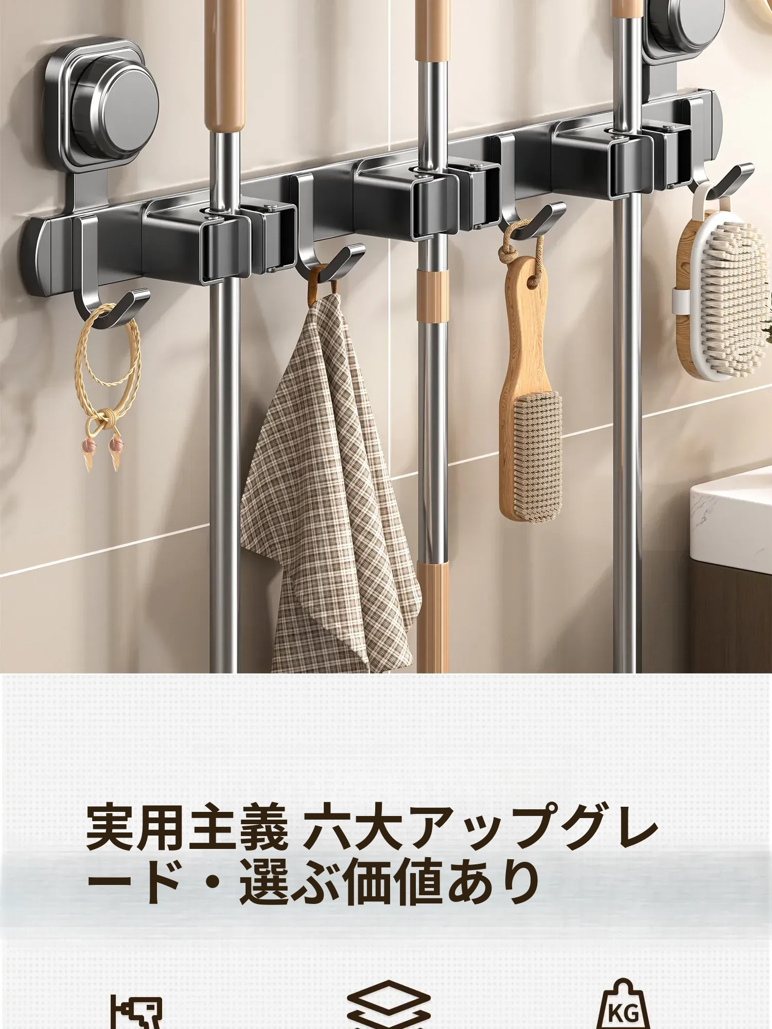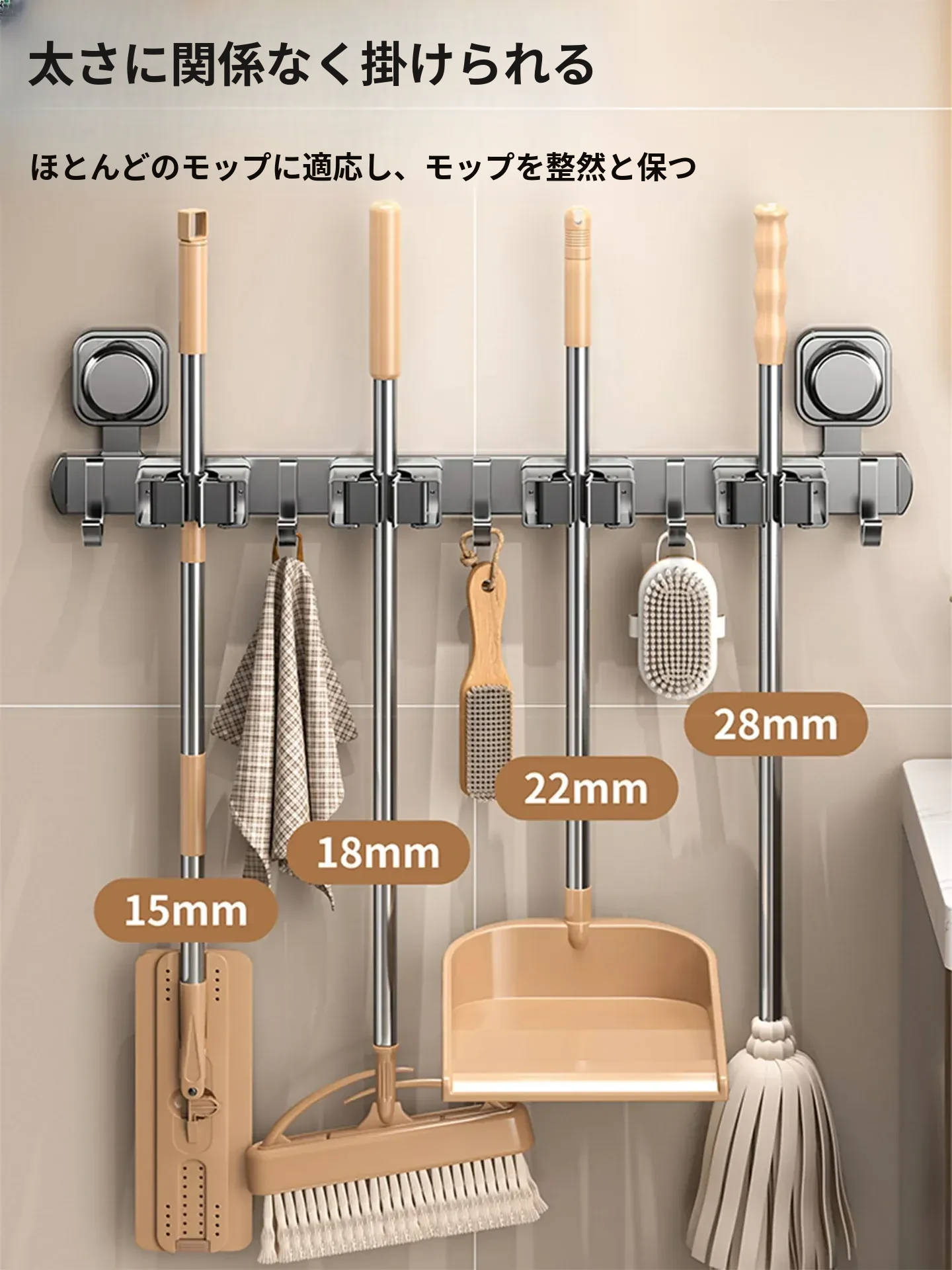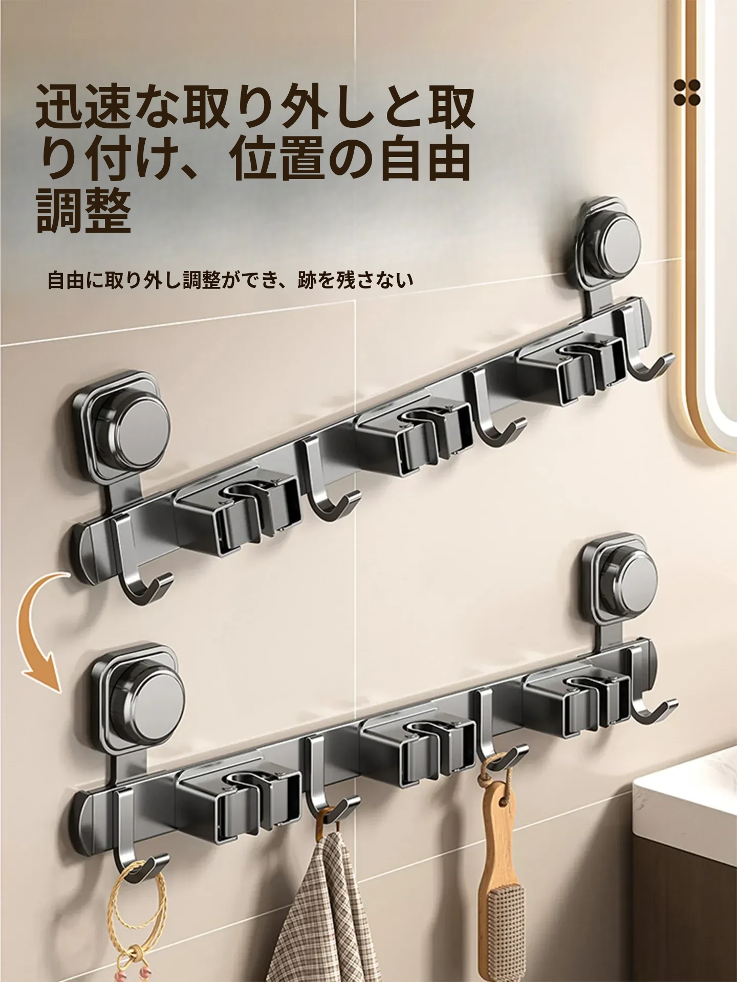 穴あけ不要!強力吸着のモップ壁掛けホルダー - トイレの壁にスマートに収納、モップやほうきをしっかり固定する便利なアイテム!整理整頓を簡単に実現!