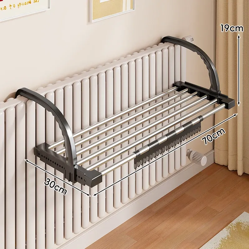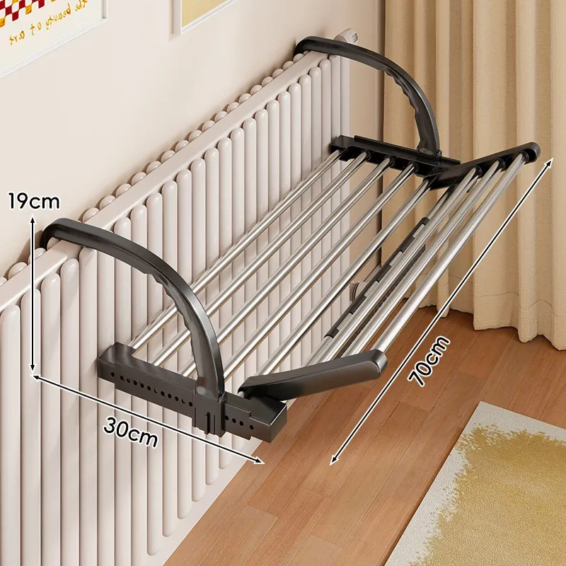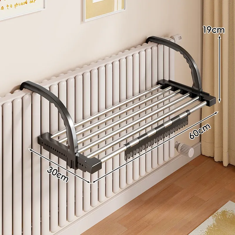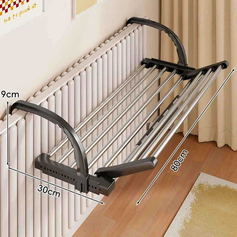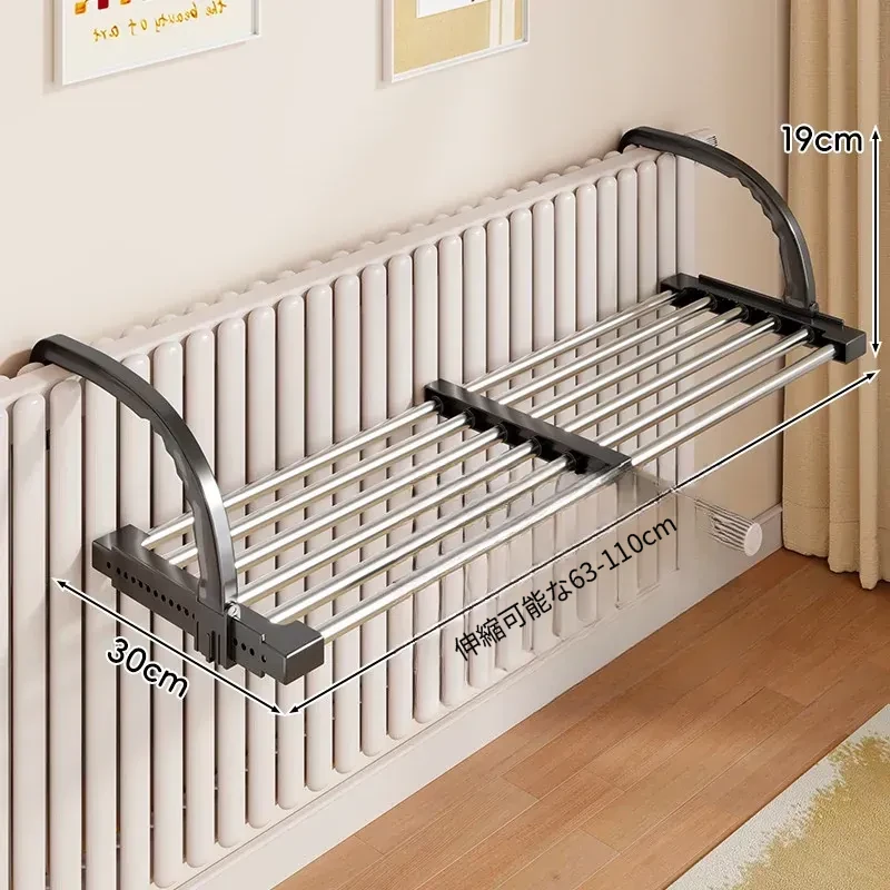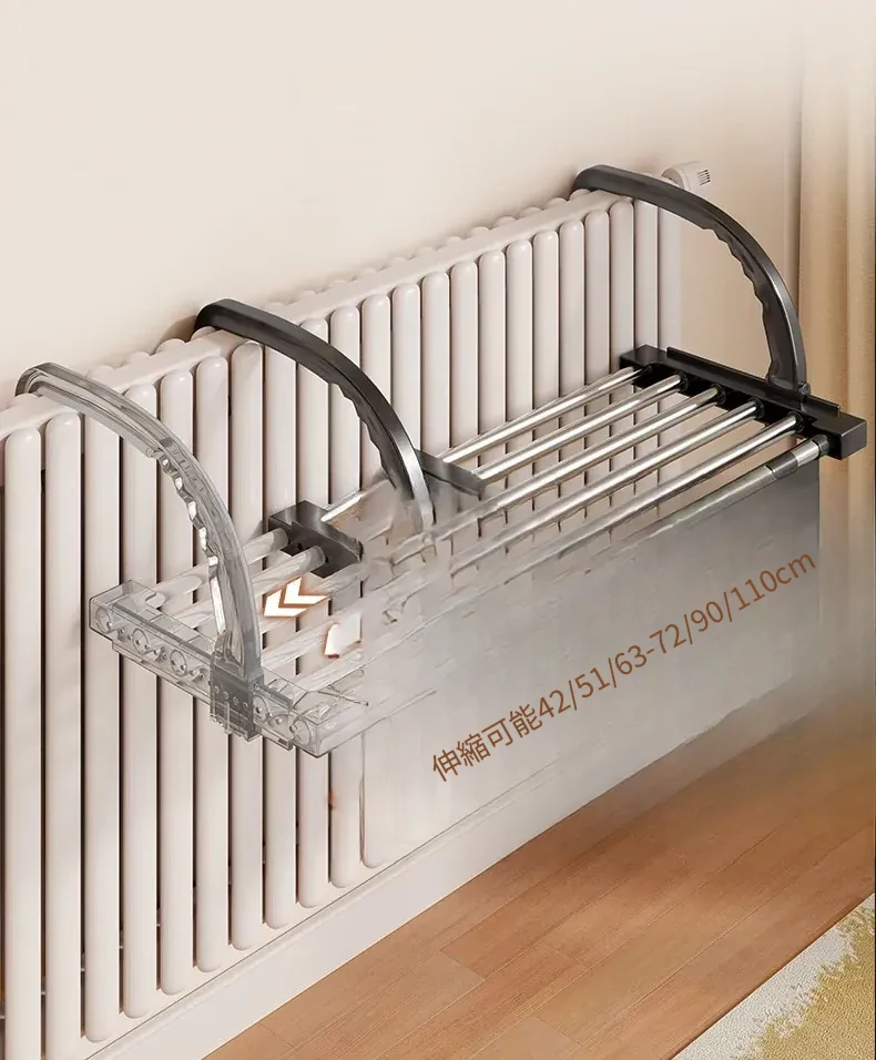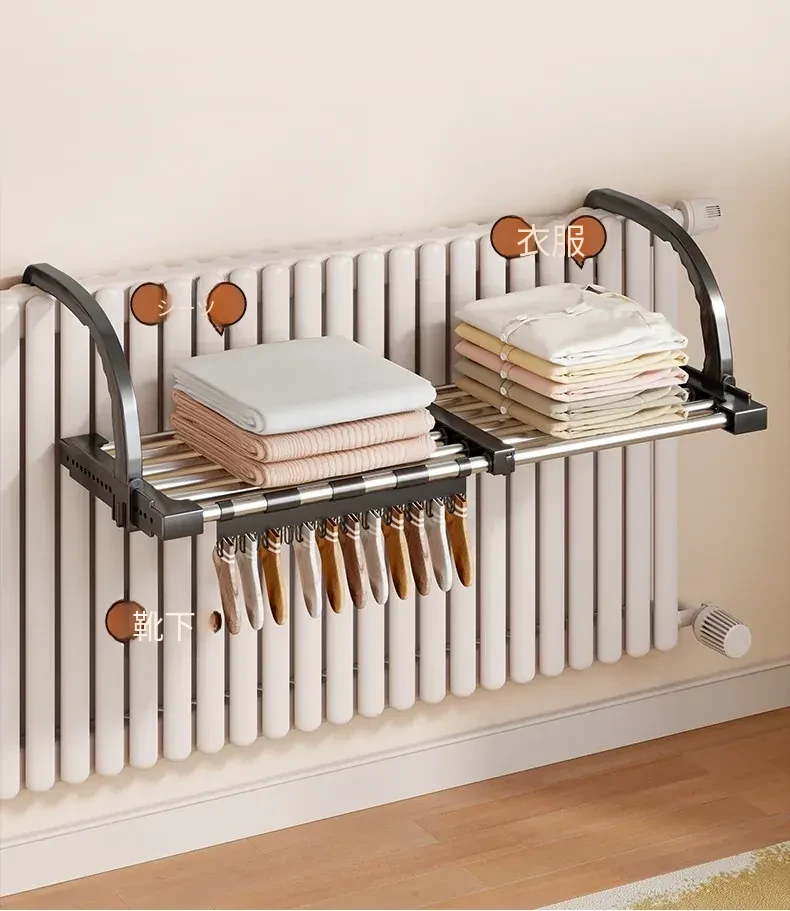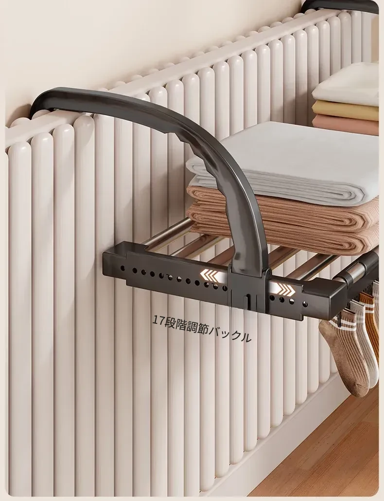 伸縮式暖房用物干しラック!バルコニーの手すりにもぴったりで、靴や衣類を効率的に干せる便利な折りたたみ収納ラック。家でのスペースを有効活用して、快適な生活をサポートします!