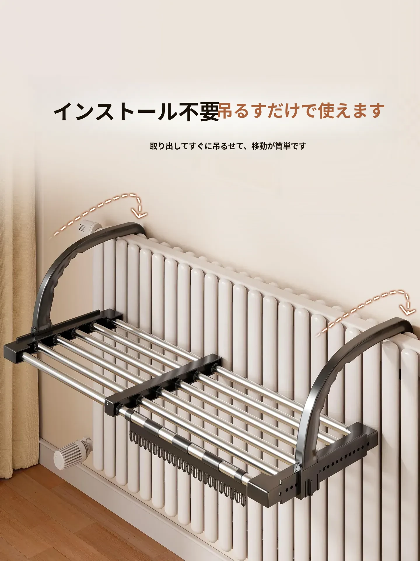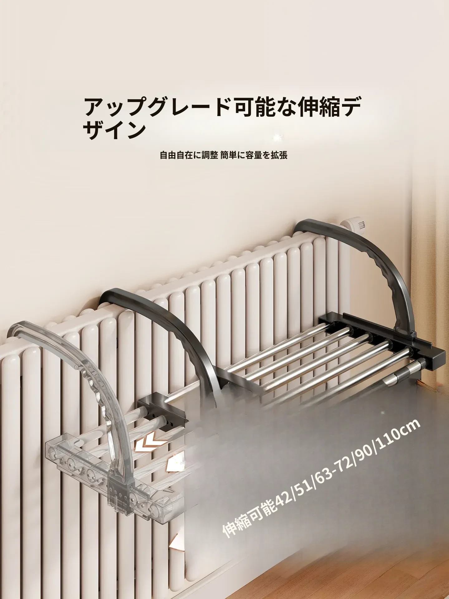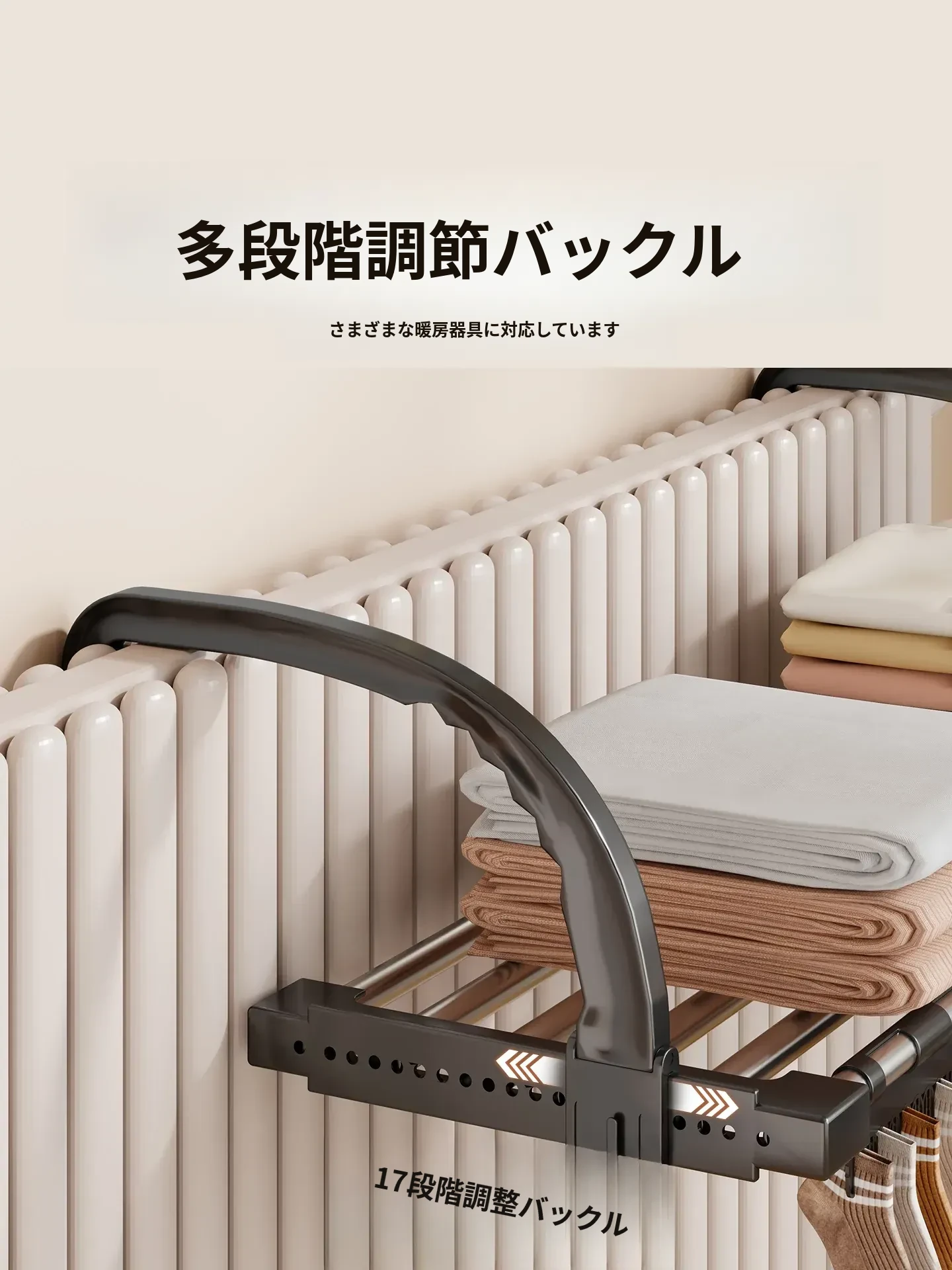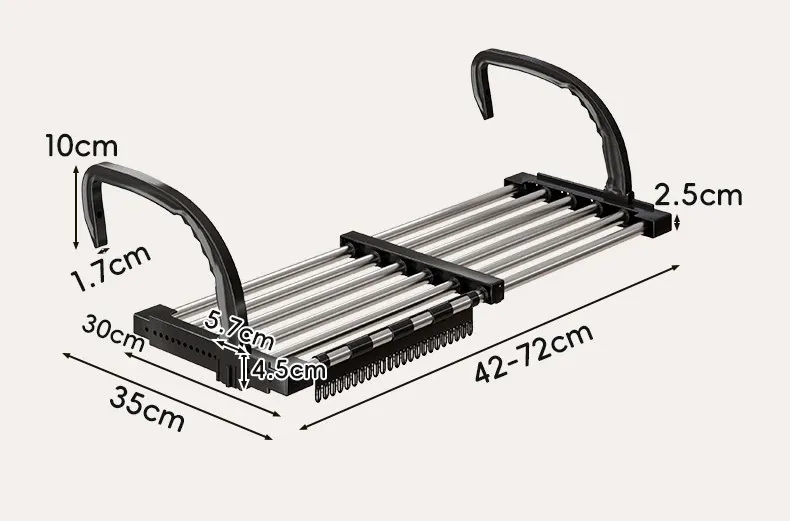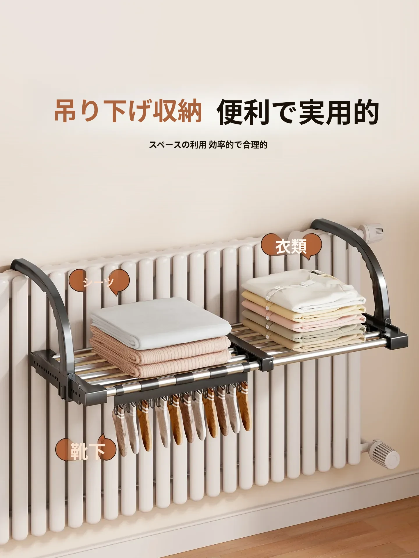 伸縮式暖房用物干しラック!バルコニーの手すりにもぴったりで、靴や衣類を効率的に干せる便利な折りたたみ収納ラック。家でのスペースを有効活用して、快適な生活をサポートします!