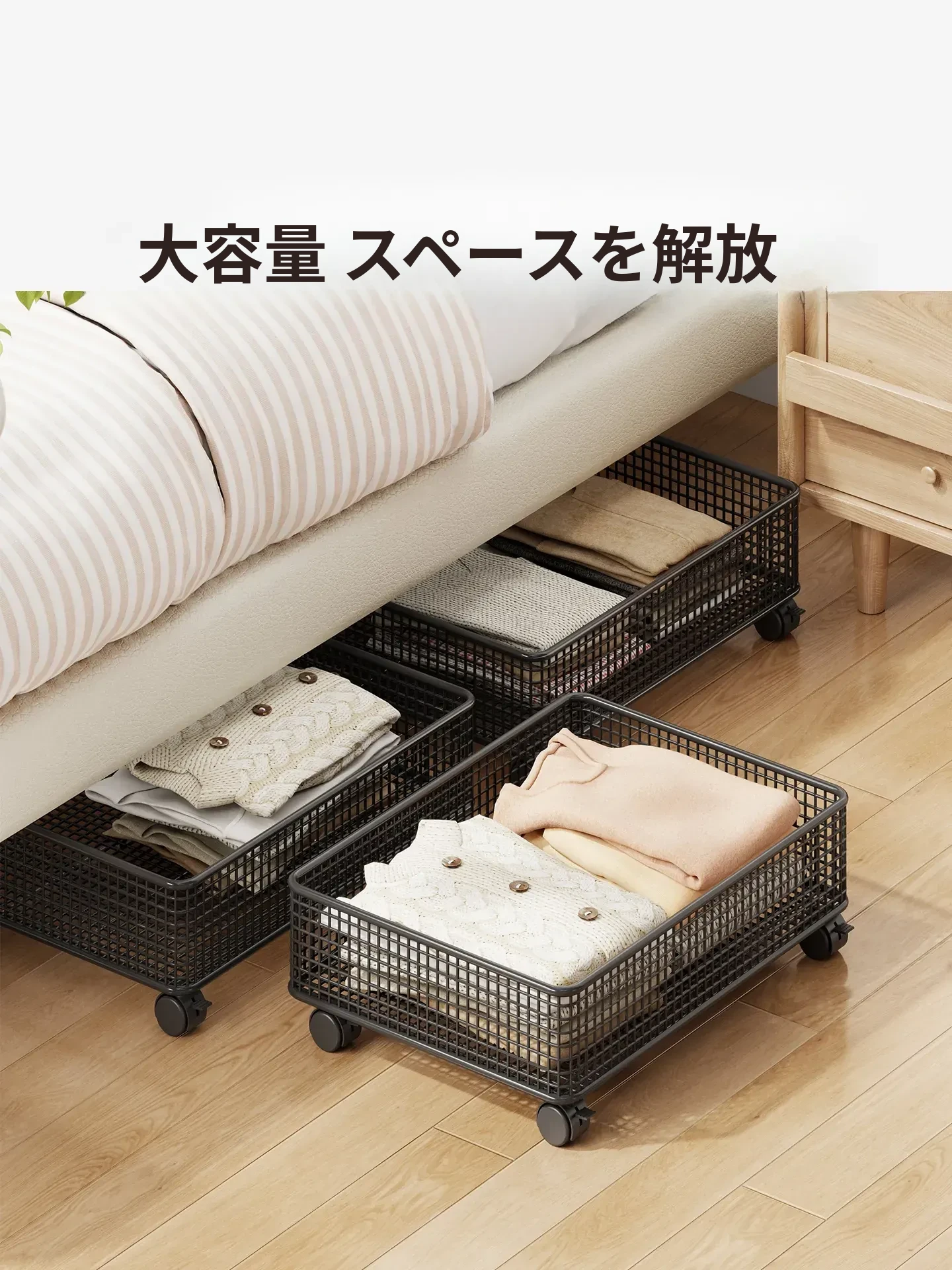 キャスター付きベッド下収納ボックス - 超薄型大容量!衣類や布団をスッキリ整理できる引き出し式収納ケース。移動ラクラクで、スペースを有効活用!