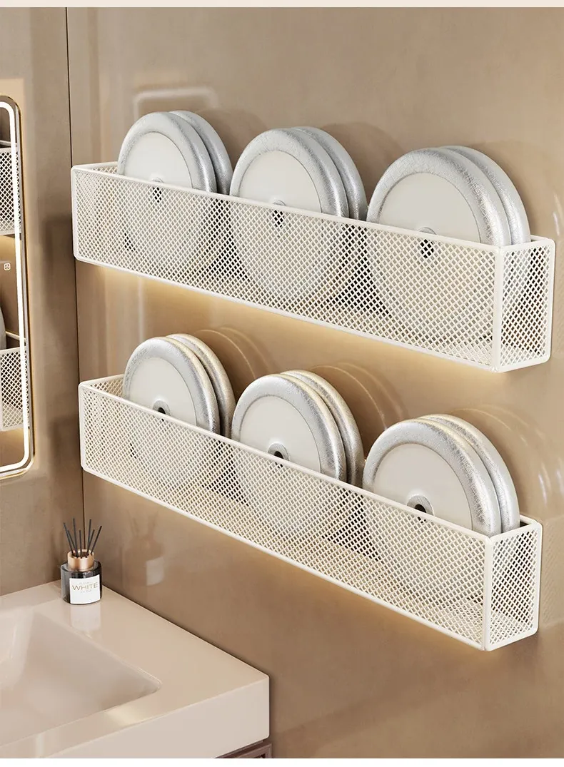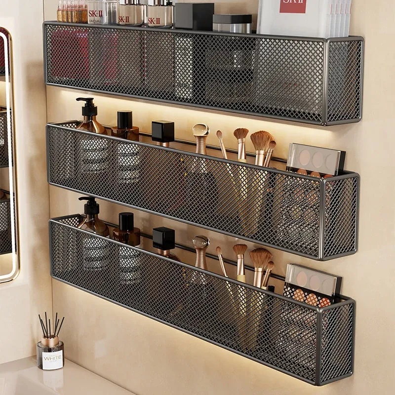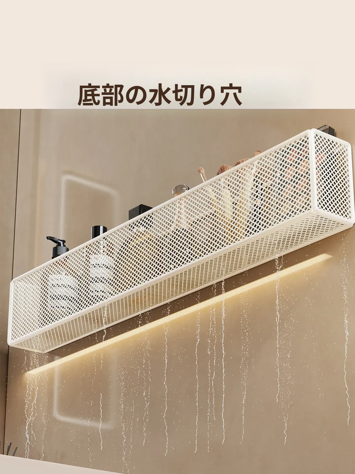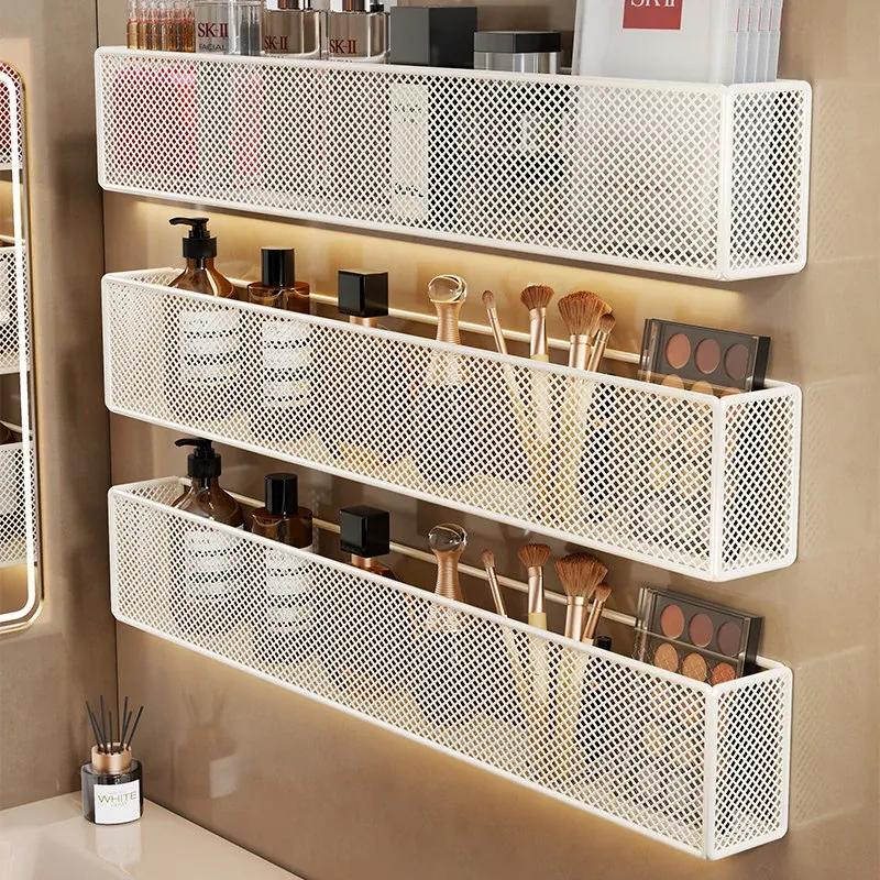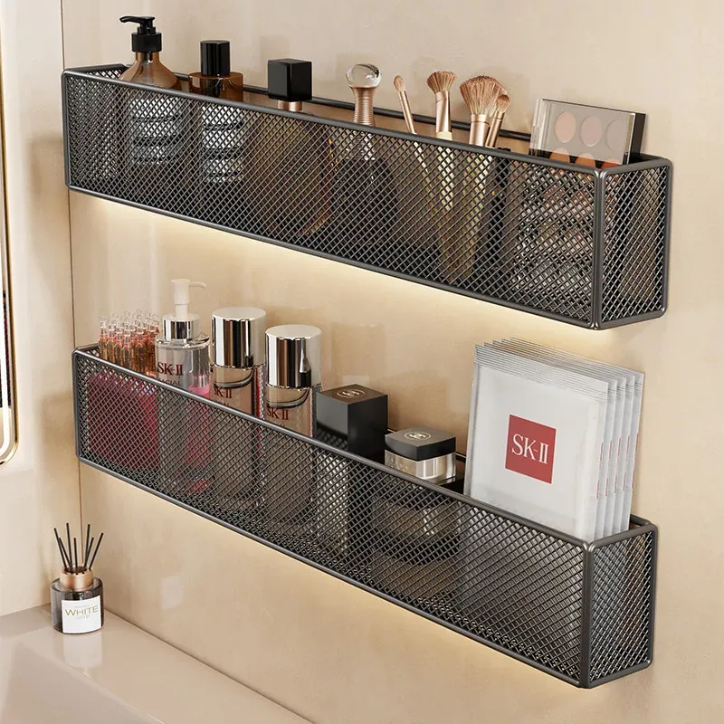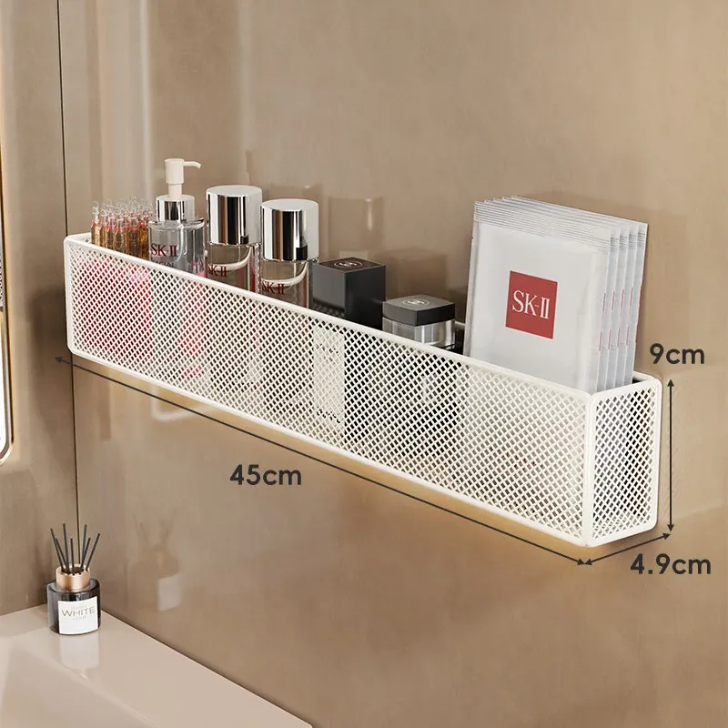 壁掛け浴室収納ラック - 水切り機能付きで化粧品やスキンケアをスッキリ整理!トイレや洗面台の上にピッタリ、穴を開けずに簡単取り付け。おしゃれで実用的な収納ソリューション!