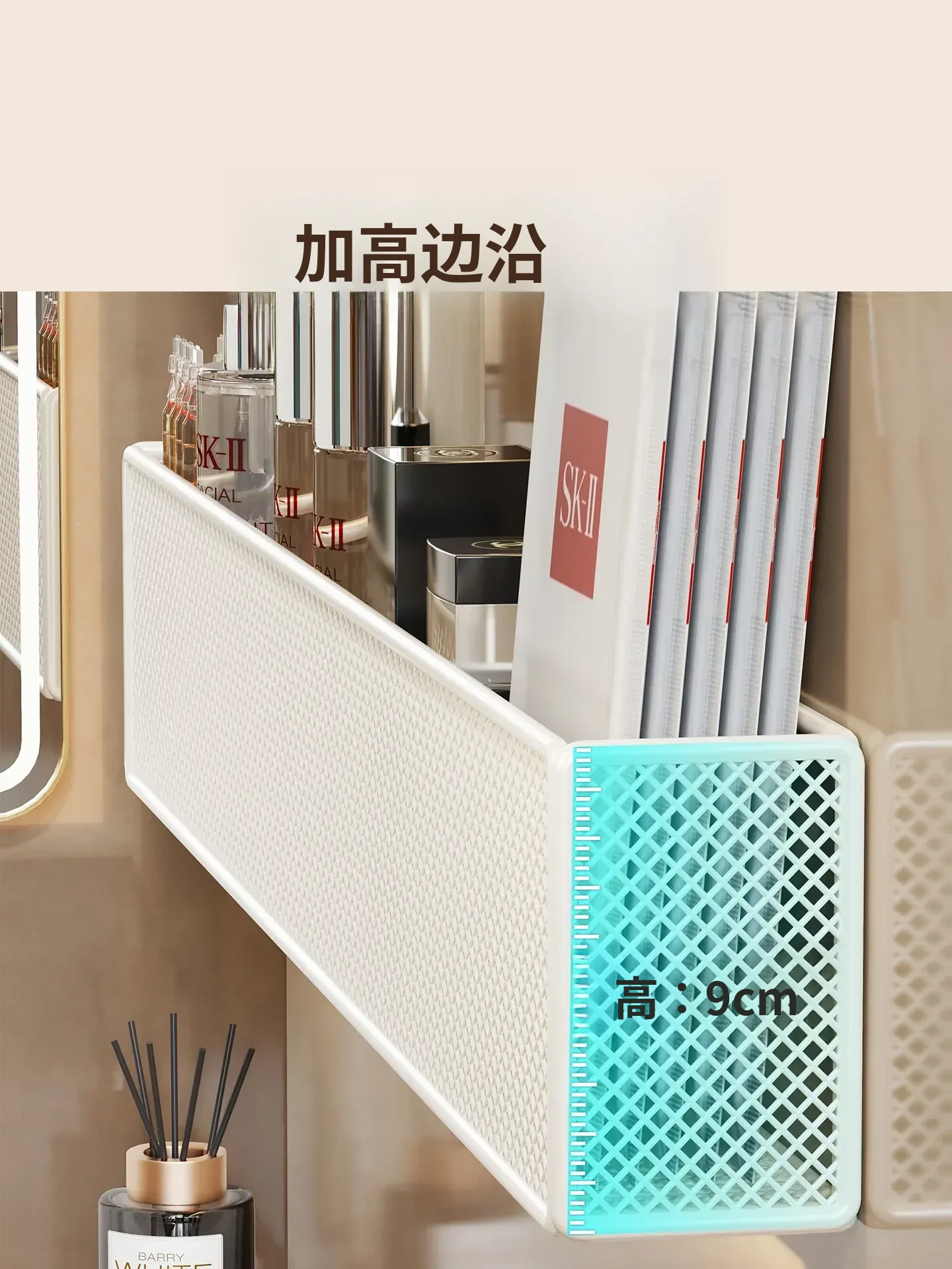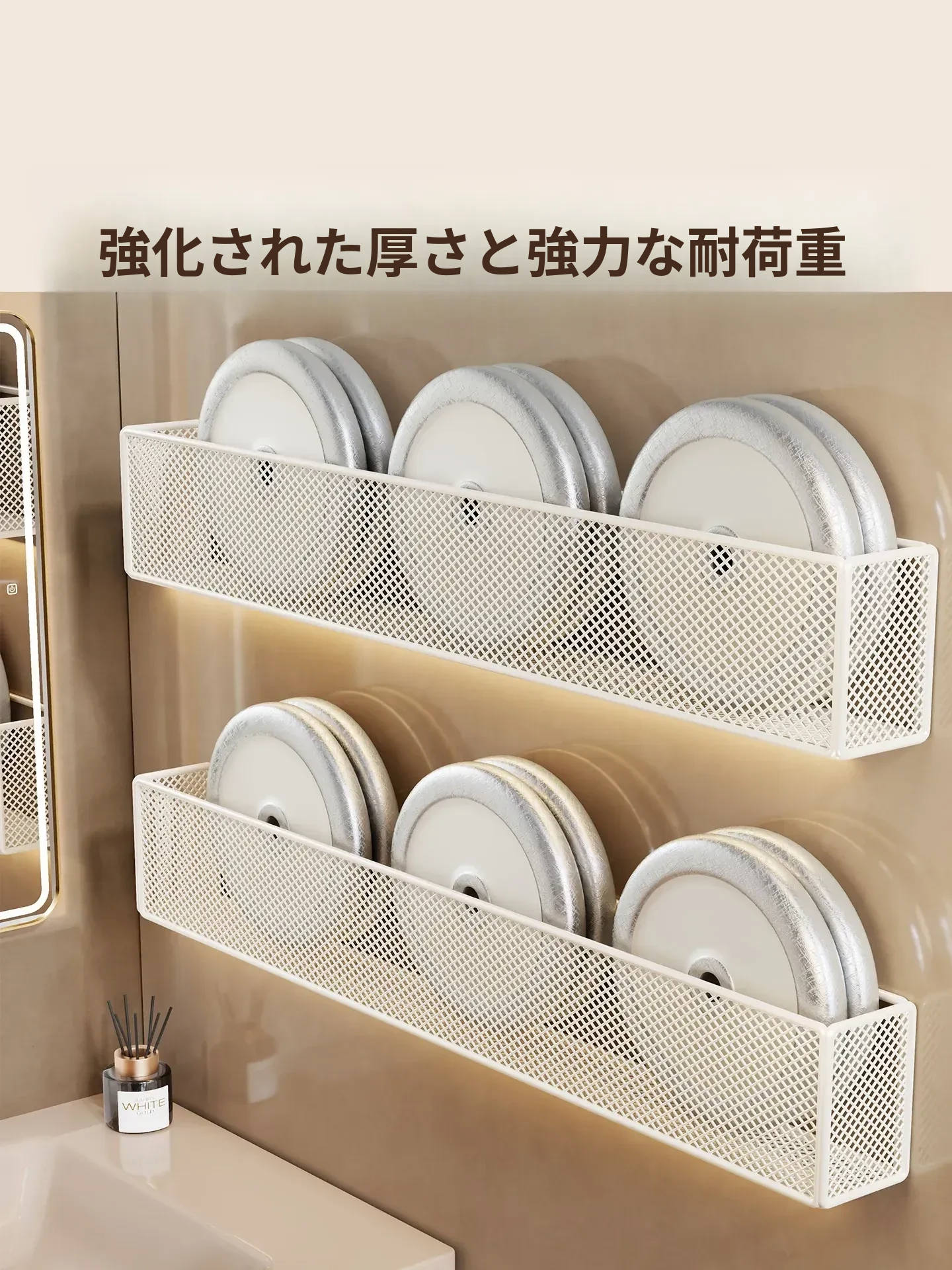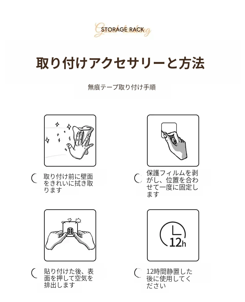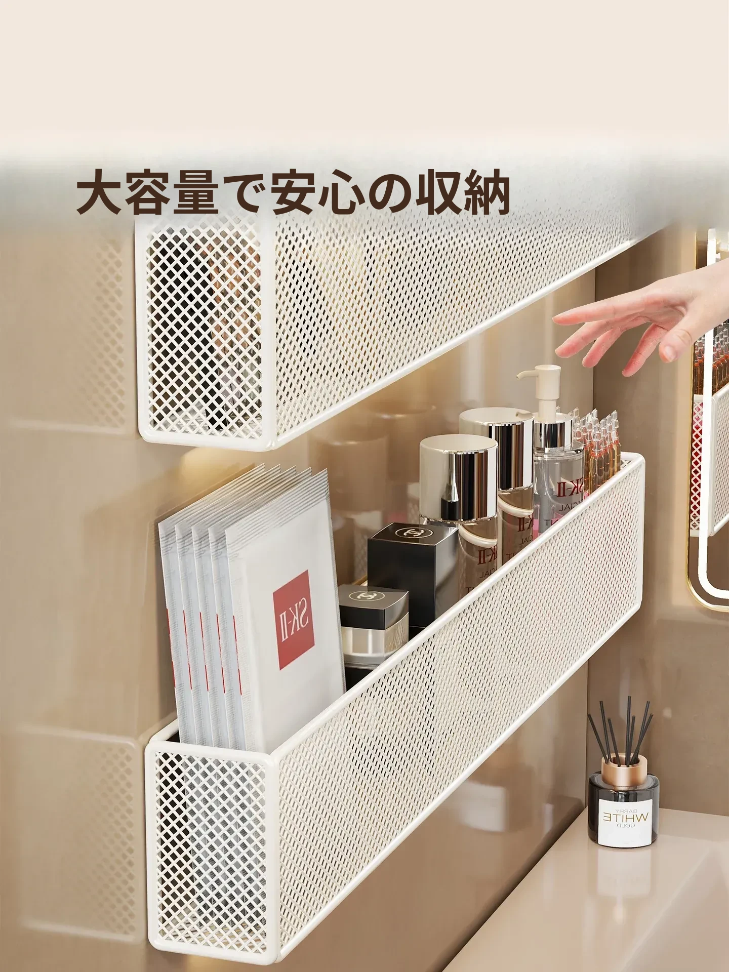 壁掛け浴室収納ラック - 水切り機能付きで化粧品やスキンケアをスッキリ整理!トイレや洗面台の上にピッタリ、穴を開けずに簡単取り付け。おしゃれで実用的な収納ソリューション!