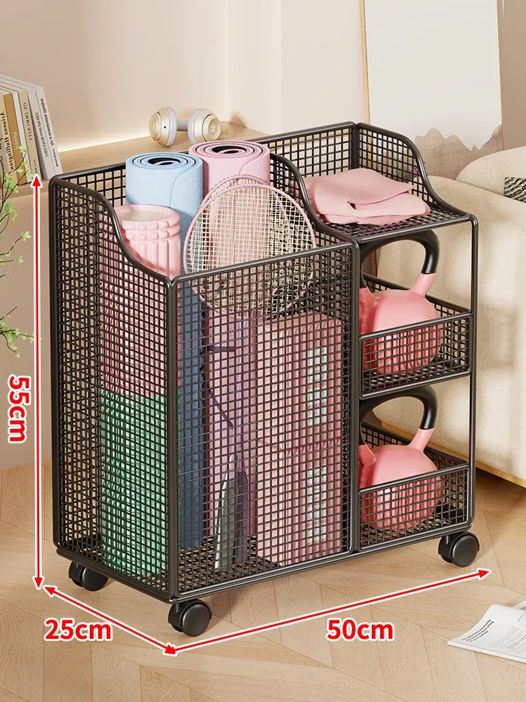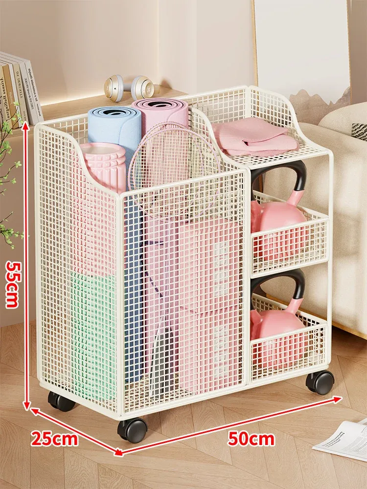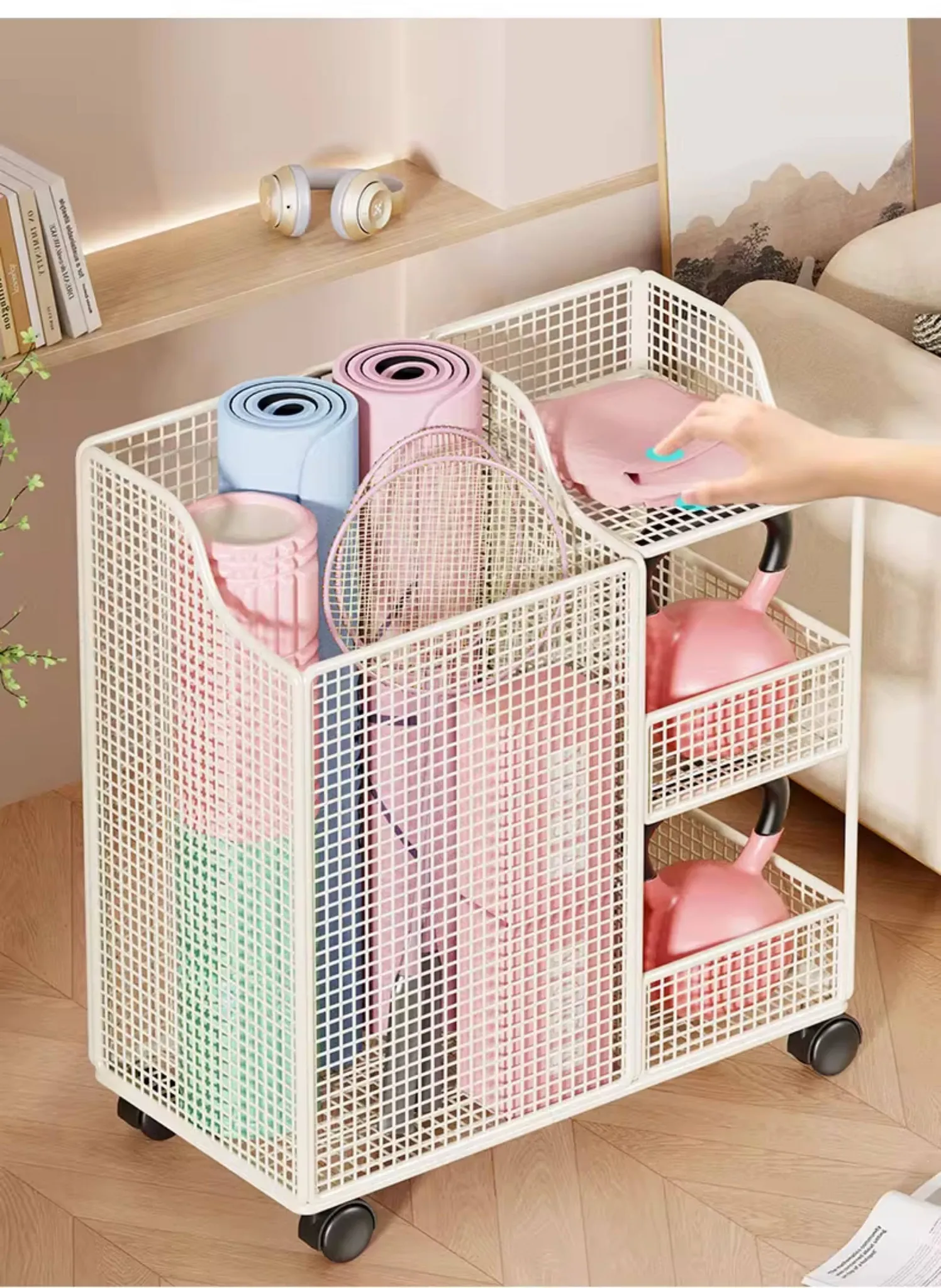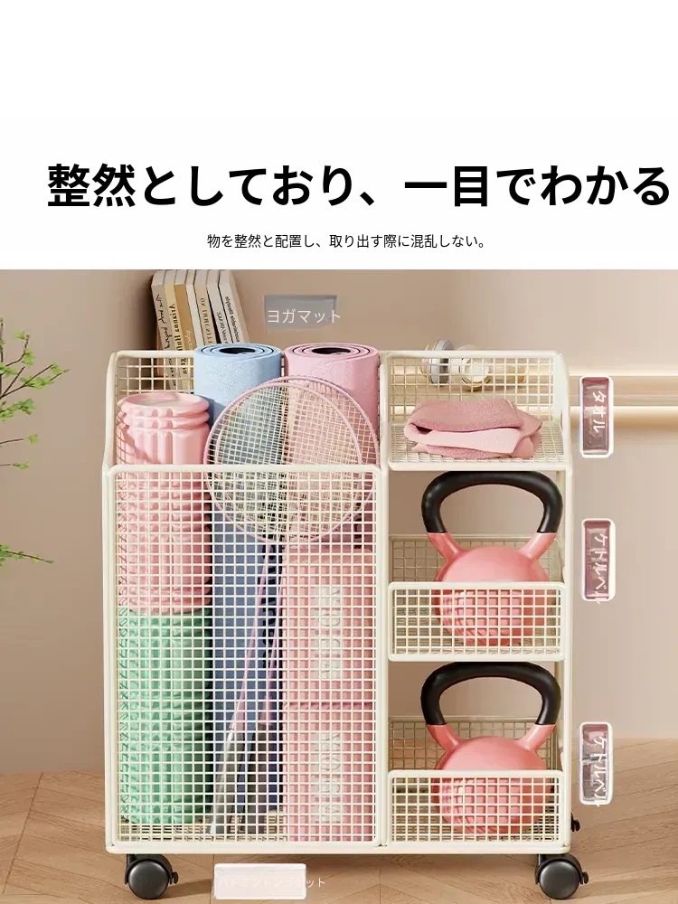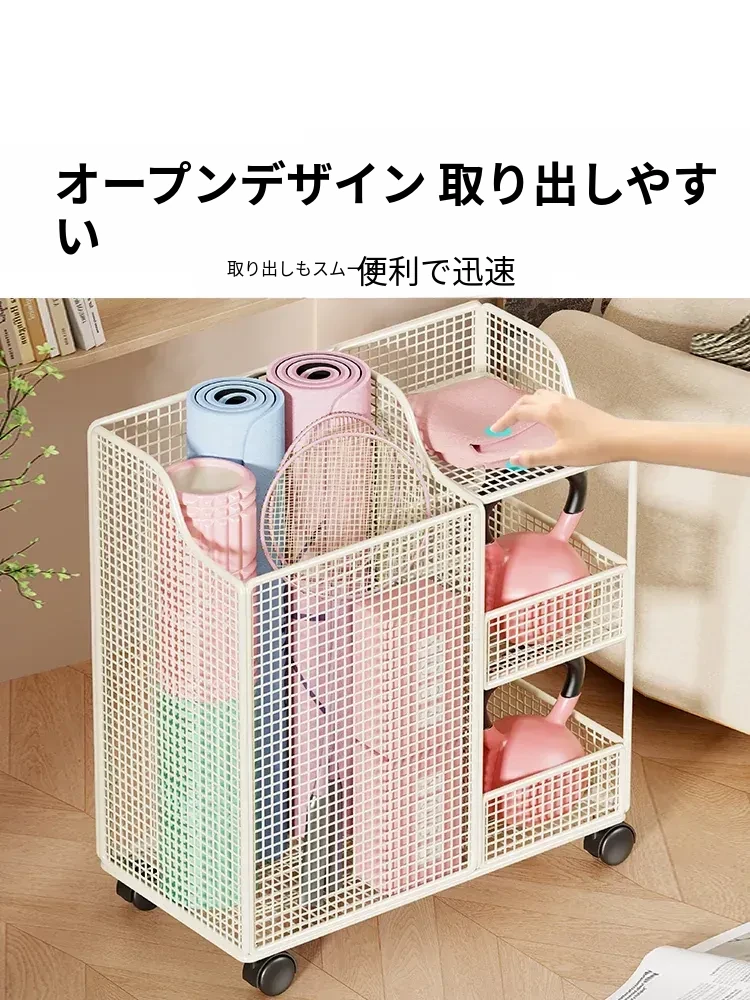 ヨガマット収納バスケット 家庭用 キャスター付き スポーツツール フォームローラー 整理整頓の必需品 フィットネス器具 便利な収納ラック