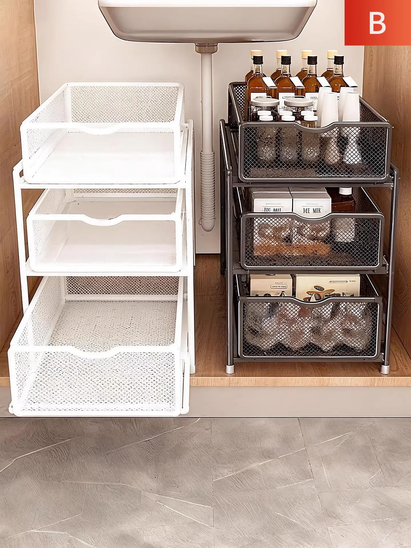 キッチン引き出し式収納ラック 二段式キャビネット内仕切り棚 深型シンク下引き出しバスケット 収納の必需品!スッキリ整理整頓を実現!