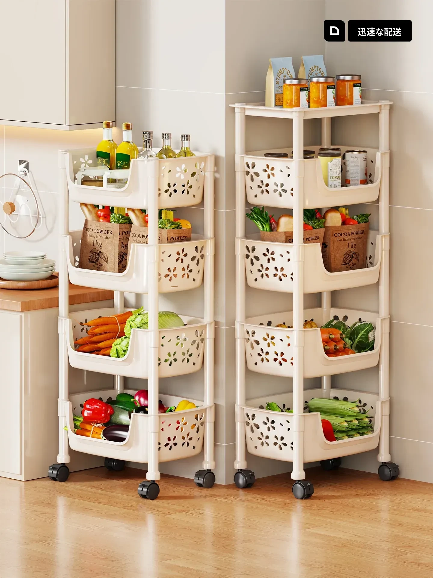 多機能キッチン収納ラック - 野菜や果物、スナックをスッキリ整理!置き場所を選ばないスタイリッシュなデザインの多層カートで、家事をもっと楽に。あなたのキッチンを美しく整えましょう!