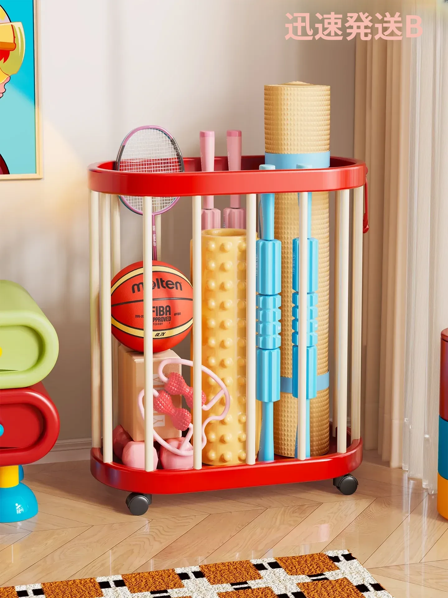 フィットネス器具収納マジック!キャスター付きの移動式ヨガマット収納バスケット。スポーツ用品をすっきり整理できる便利な置物ラック!