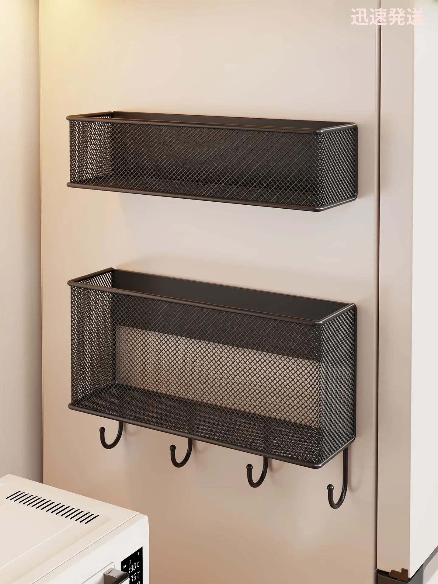 冷蔵庫用マグネット収納ラック!穴あけ不要の壁掛け式で、ラップやティッシュをスッキリ整理。調味料のフックも完備!キッチンを美しく保つ便利アイテム!