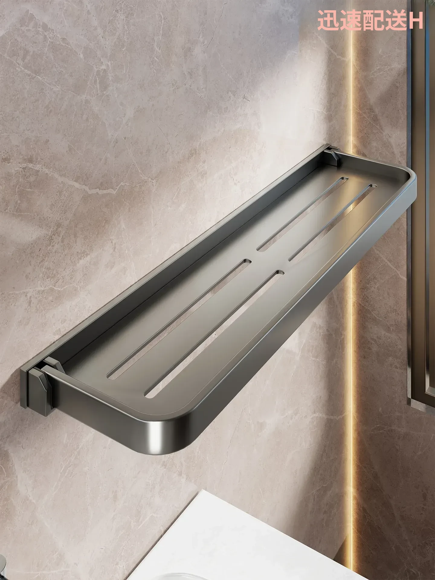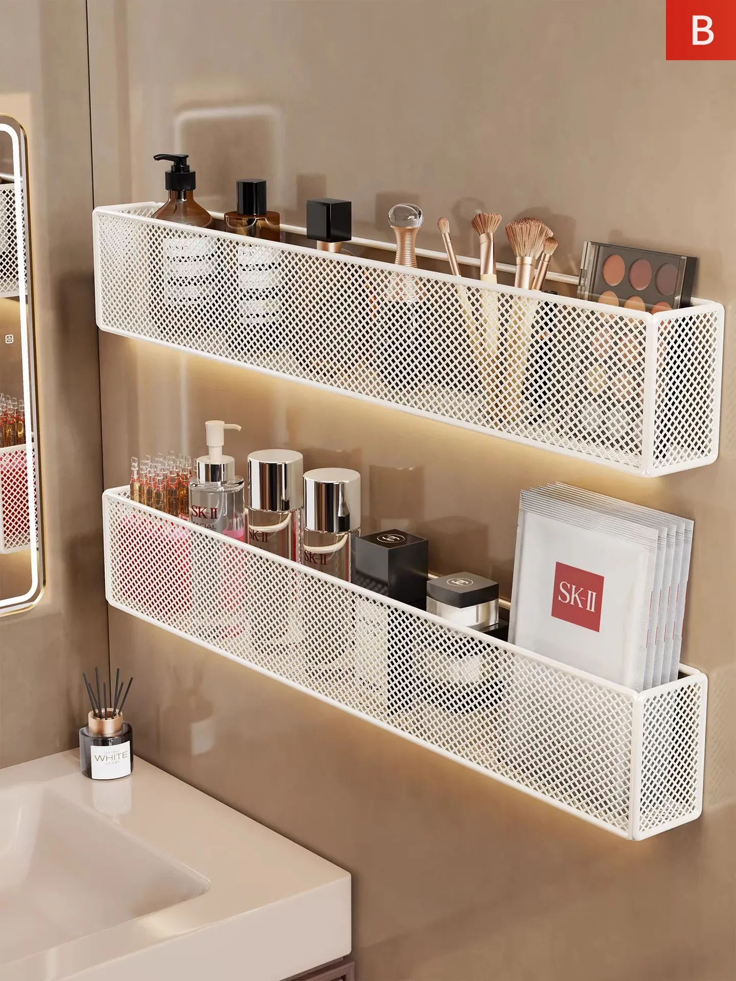 壁掛け浴室収納ラック - 水切り機能付きで化粧品やスキンケアをスッキリ整理!トイレや洗面台の上にピッタリ、穴を開けずに簡単取り付け。おしゃれで実用的な収納ソリューション!